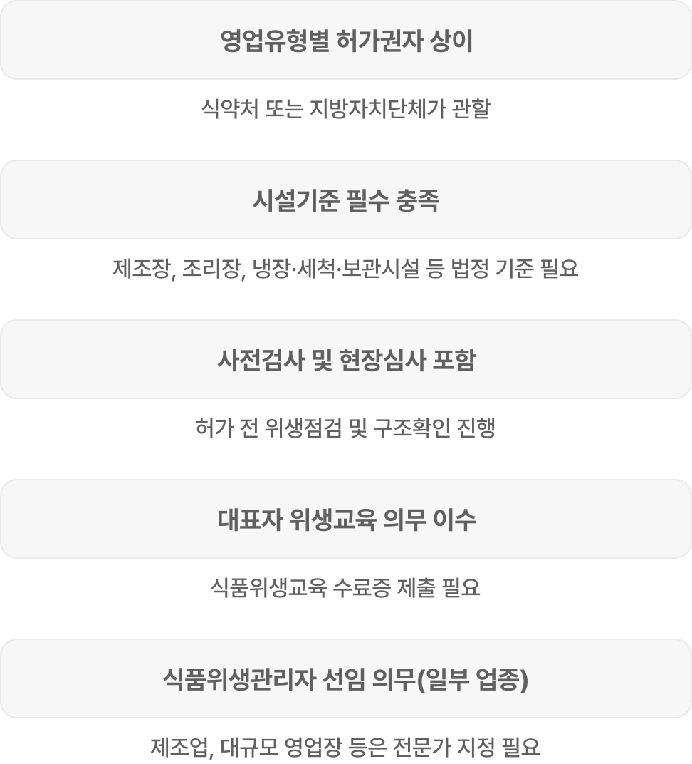 | 영업유형별 허가권자 상이 | 식약처 또는 지방자치단체가 관할 |