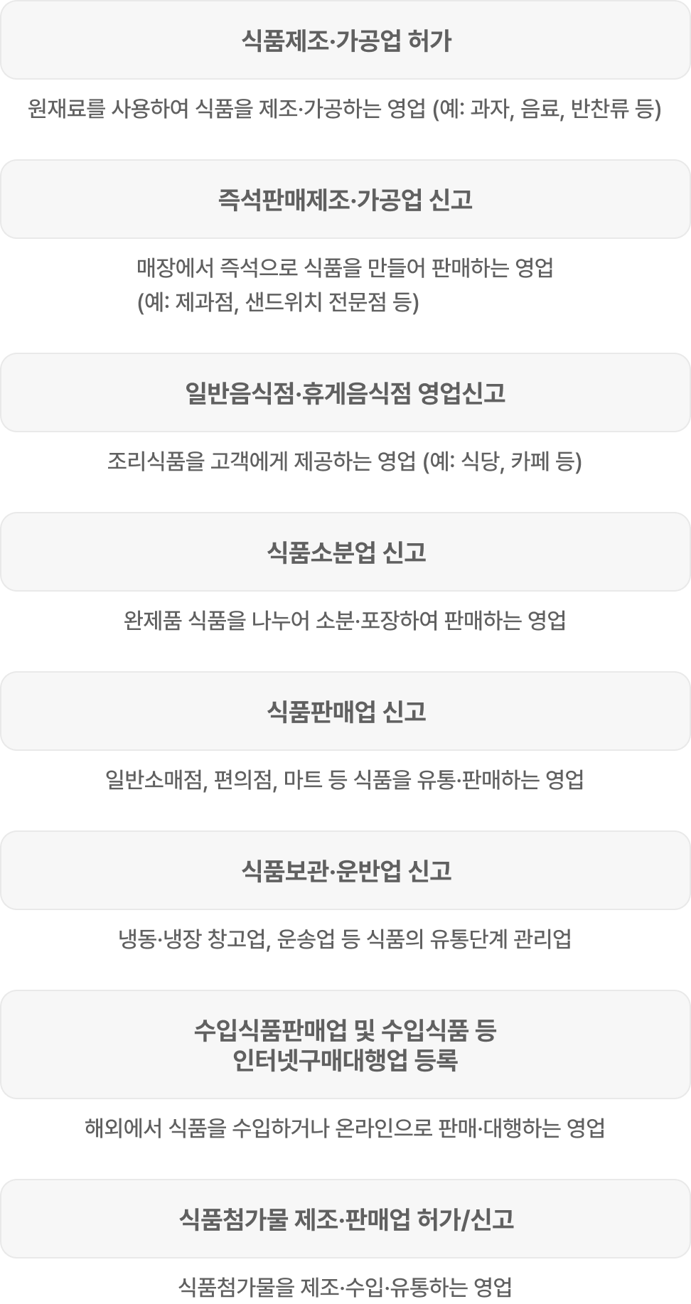 | 식품제조·가공업 허가 | 원재료를 사용하여 식품을 제조·가공하는 영업 (예: 과자, 음료, 반찬류 등) |