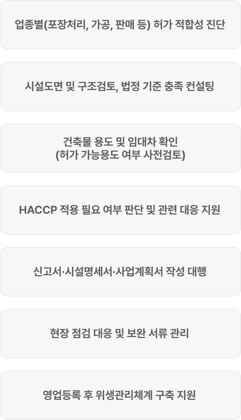 비즈앤은 단순한 인허가 대행이 아닌, 영업 가능한 구조와 위생기준을 함께 설계합니다.