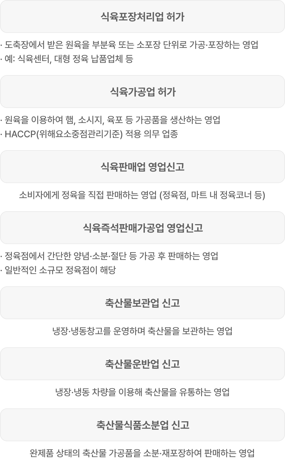 식육포장처리업, 식육판매업, 식육가공업, 축산물보관업, 운반업, 식육즉석판매가공업 등