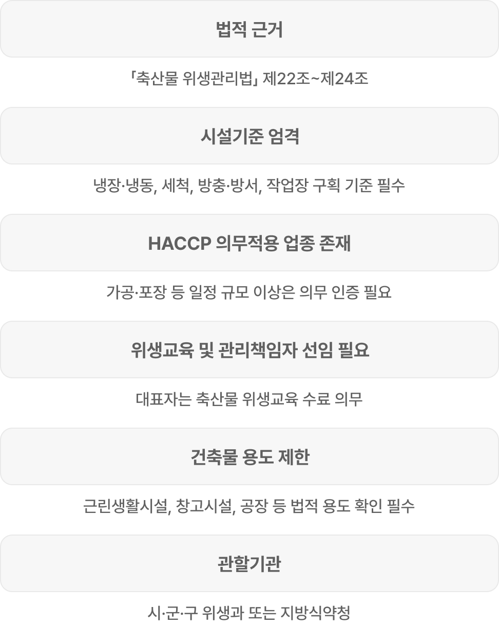 축산물 인허가는 식품위생법보다 시설기준·절차·점검 기준이 훨씬 까다로운 분야입니다.