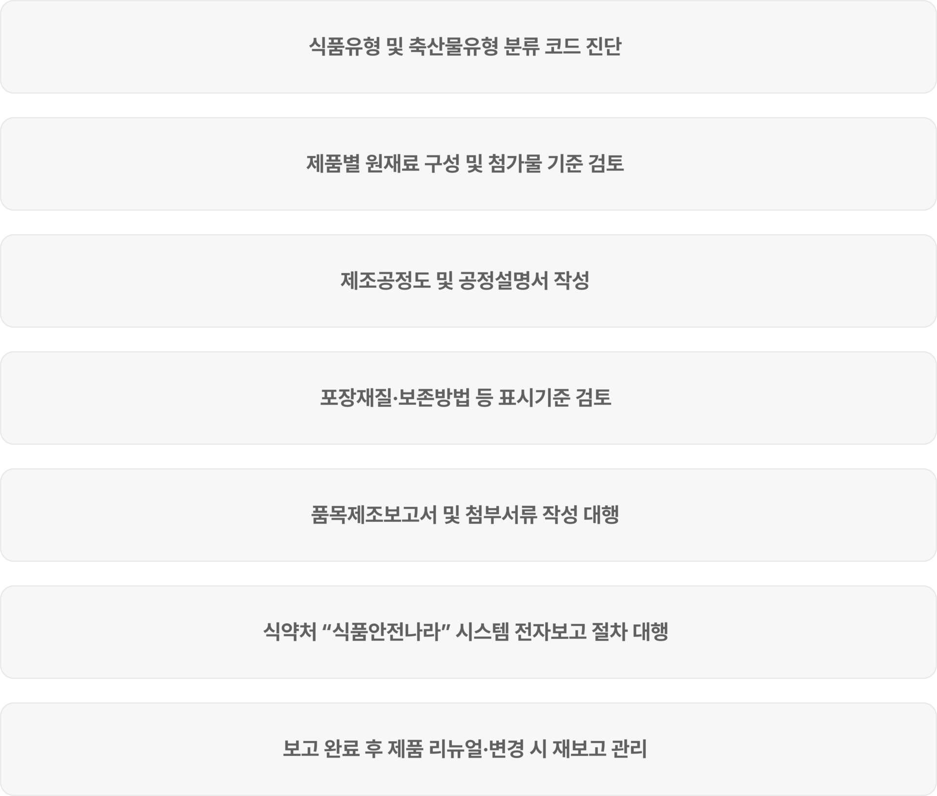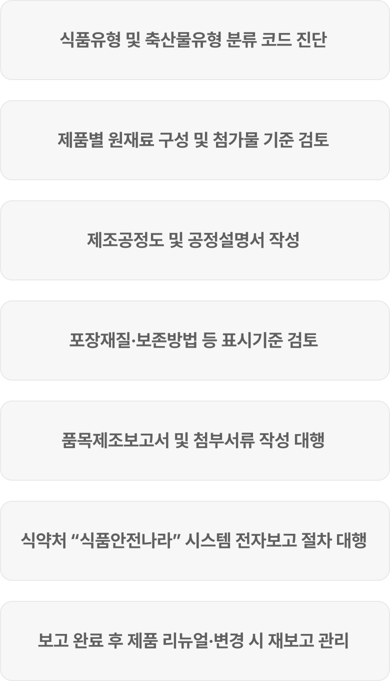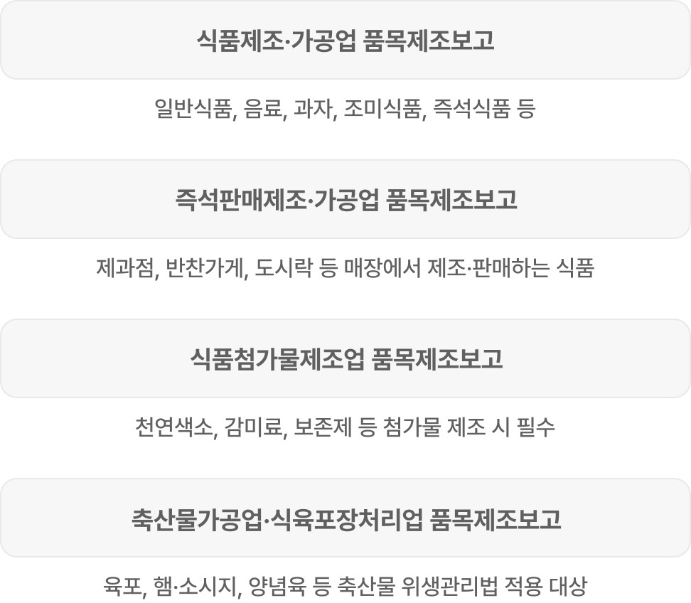 | 식품제조·가공업 품목제조보고 | 일반식품, 음료, 과자, 조미식품, 즉석식품 등 |