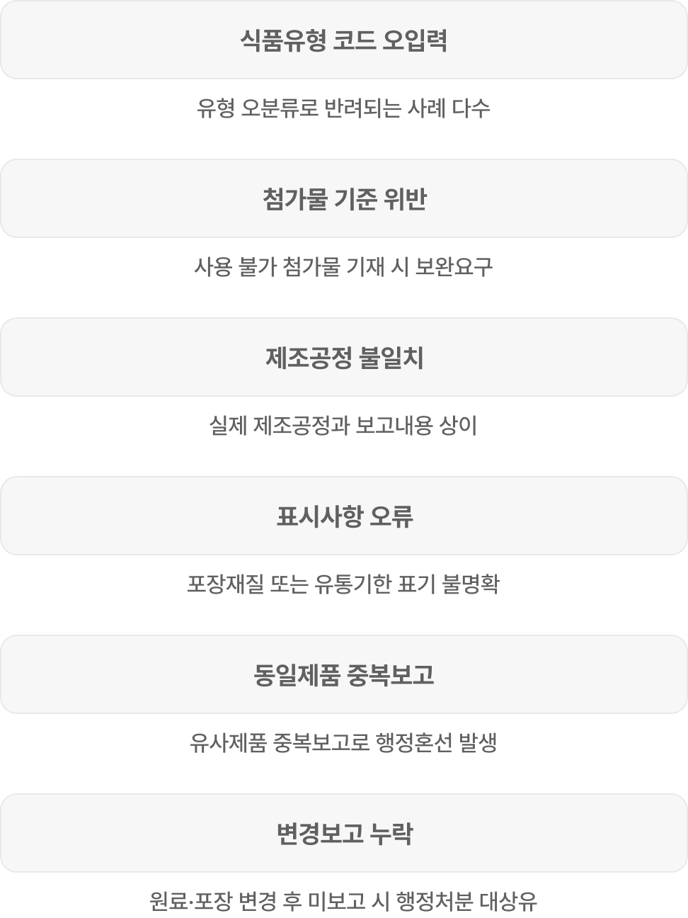 | 변경보고 누락 | 원료·포장 변경 후 미보고 시 행정처분 대상유 |