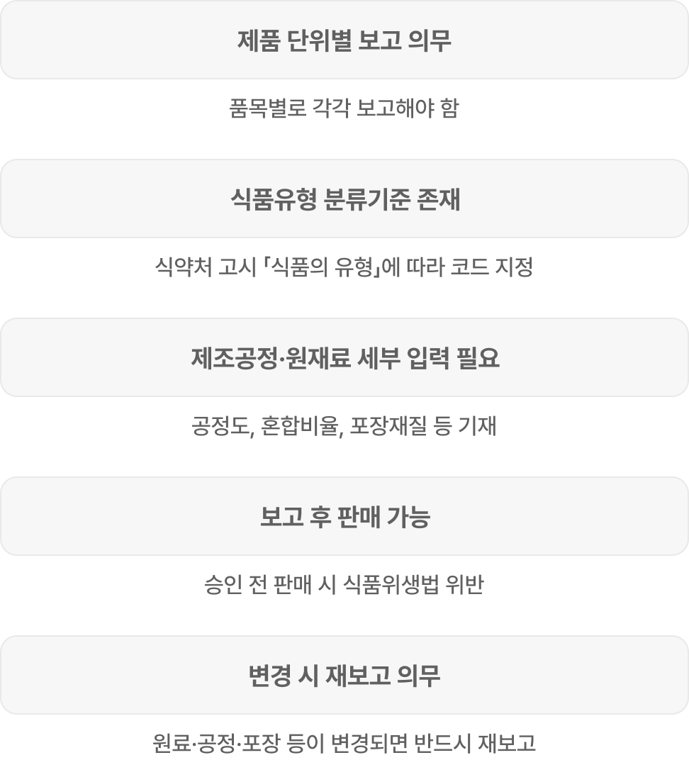 | 변경 시 재보고 의무 | 원료·공정·포장 등이 변경되면 반드시 재보고 |