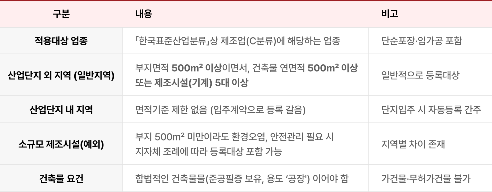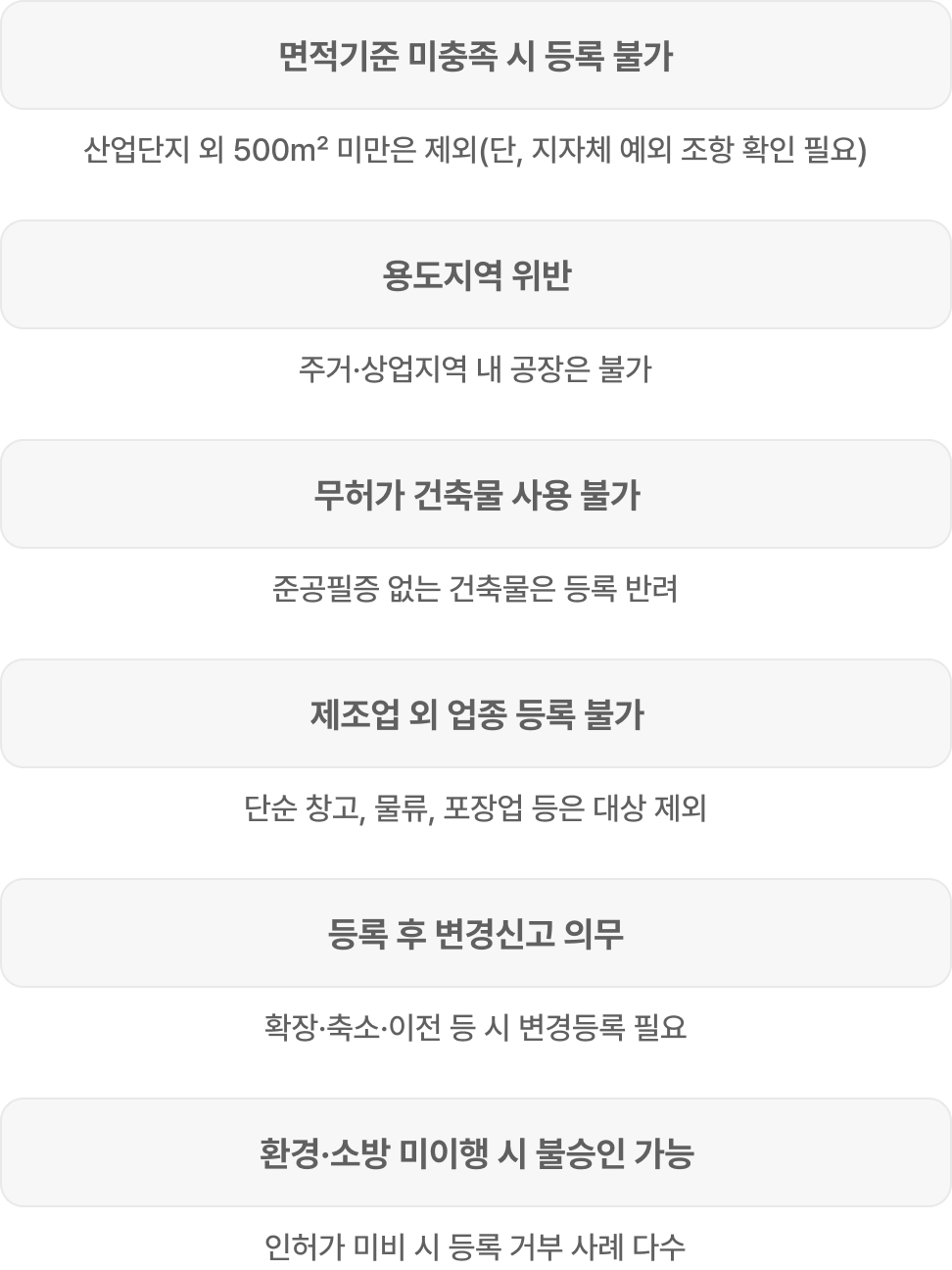 | 면적기준 미충족 시 등록 불가 | 산업단지 외 500㎡ 미만은 제외(단, 지자체 예외 조항 확인 필요) |