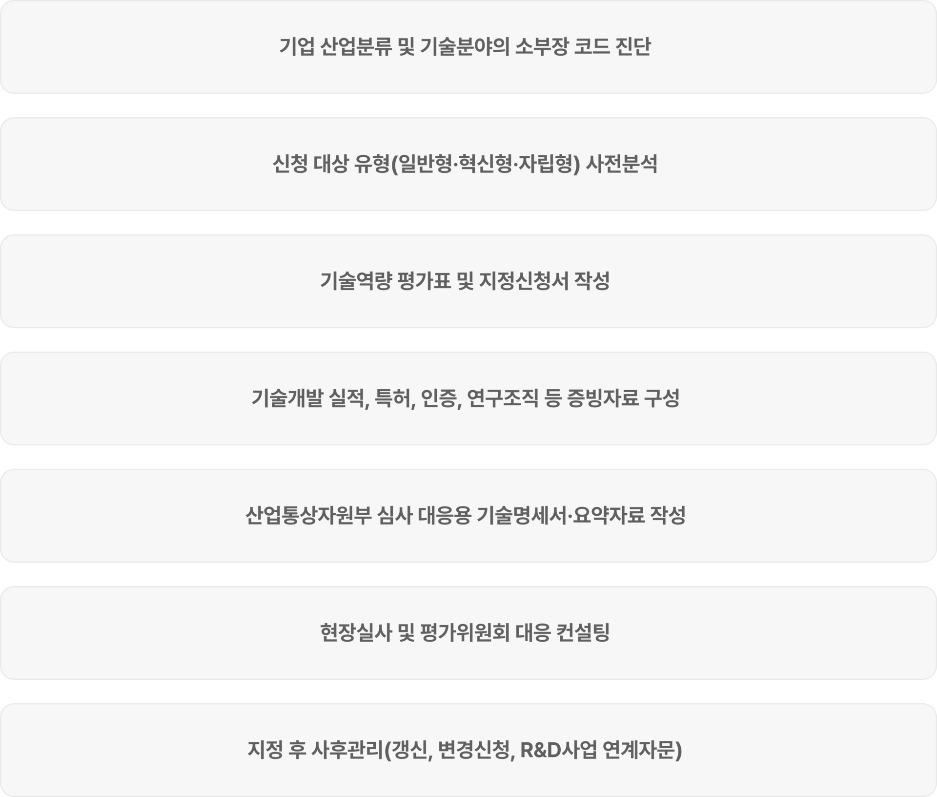 인증기업은 산업통상자원부가 제시하는 「소재·부품·장비산업 분류체계(시행령 별표1)」 내에서 활동해야 하며, 기술개발역량, 생산공정의 기술수준, 공급망 내 역할, 그리고 산업자립에 대한 기여도를 종합적으로 평가받습니다.