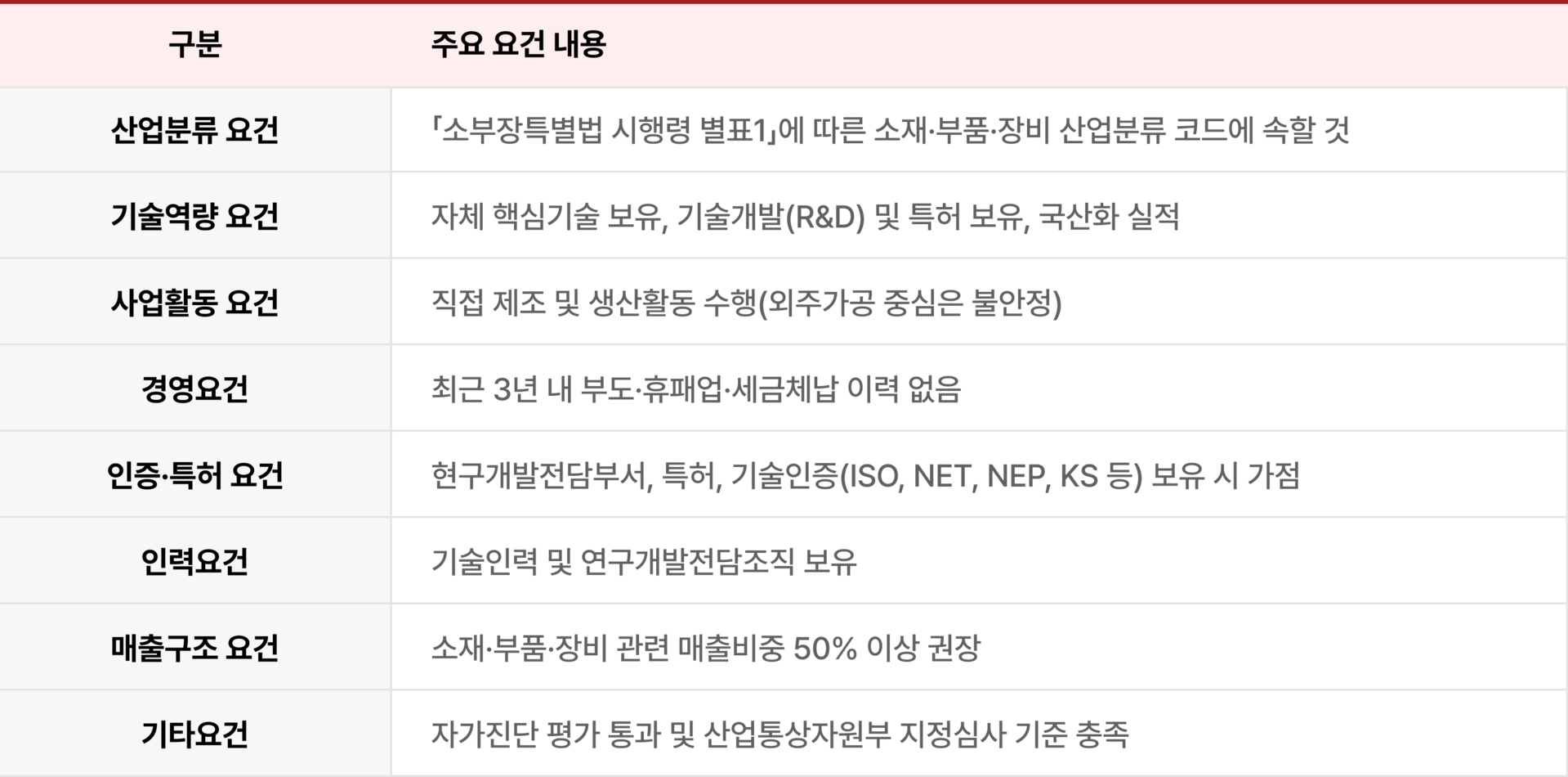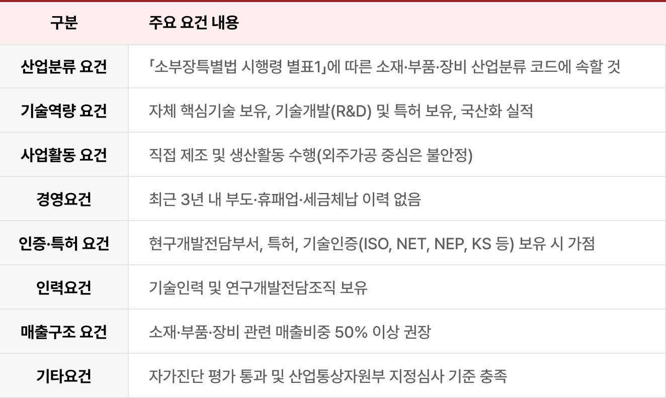 이 제도는 단순히 제조공정을 보유한 기업이 아니라, 핵심소재·부품·장비 기술을 직접 보유하거나, 국산화 및 기술자립에 실질적으로 기여할 수 있는 기업을 집중 육성하는 제도입니다.