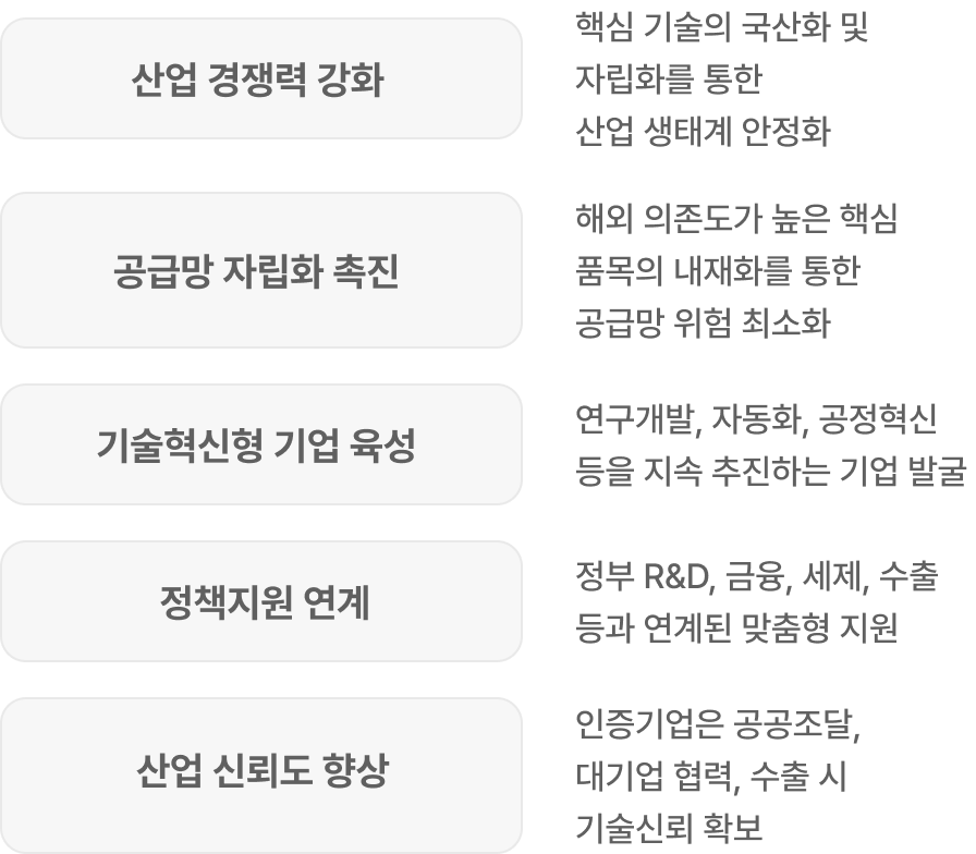 | 산업 신뢰도 향상 | 인증기업은 공공조달, 대기업 협력, 수출 시 기술신뢰 확보 |