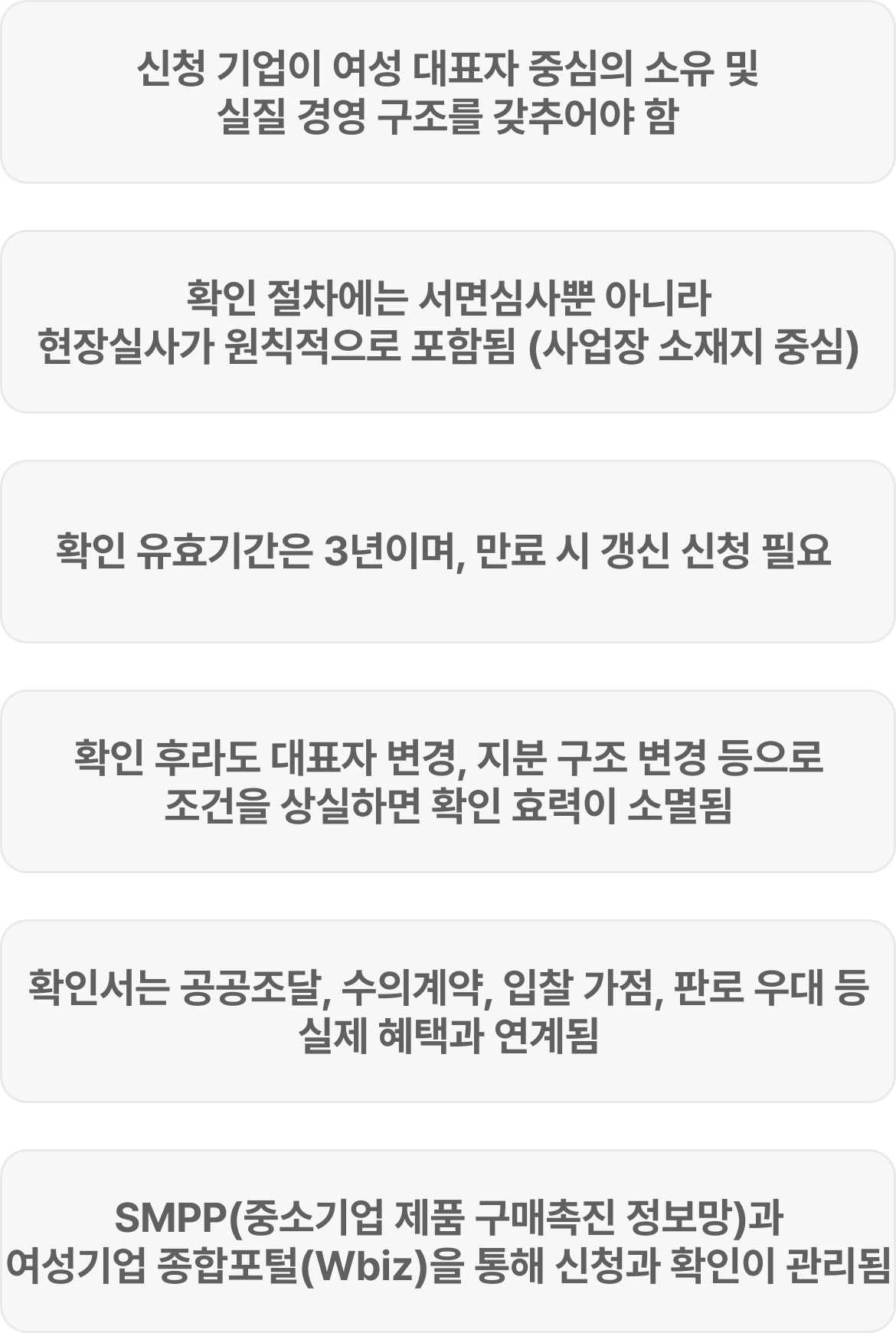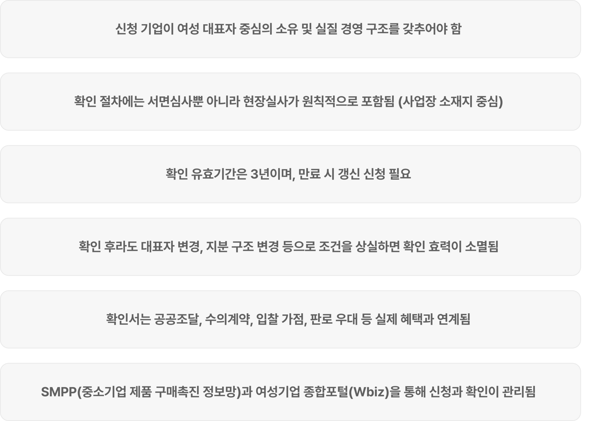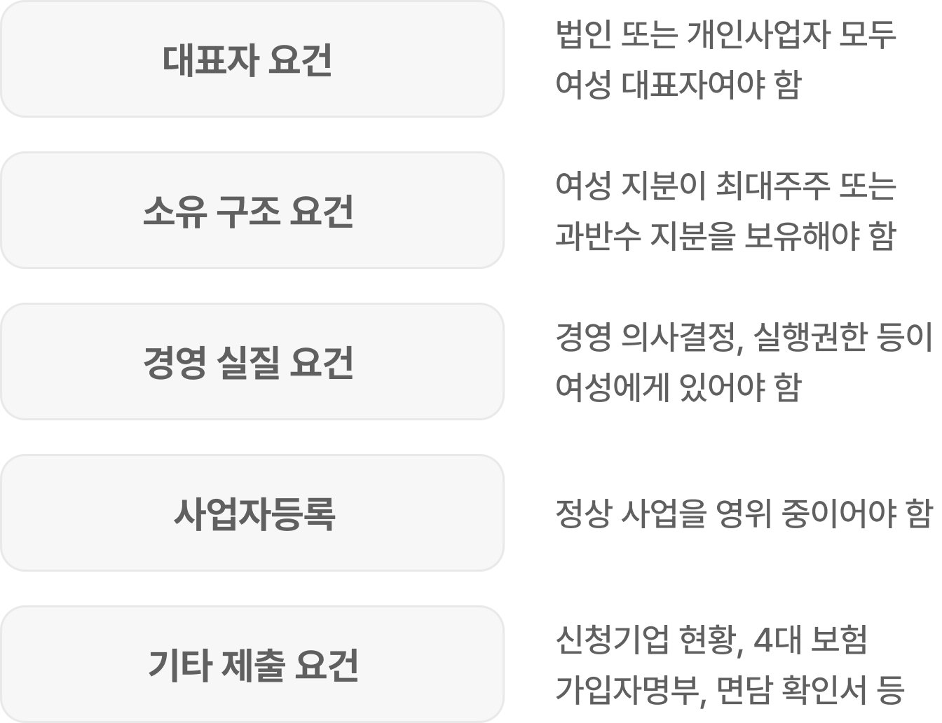 | 경영 실질 요건 | 경영 의사결정, 실행권한 등이 여성에게 있어야 함 |