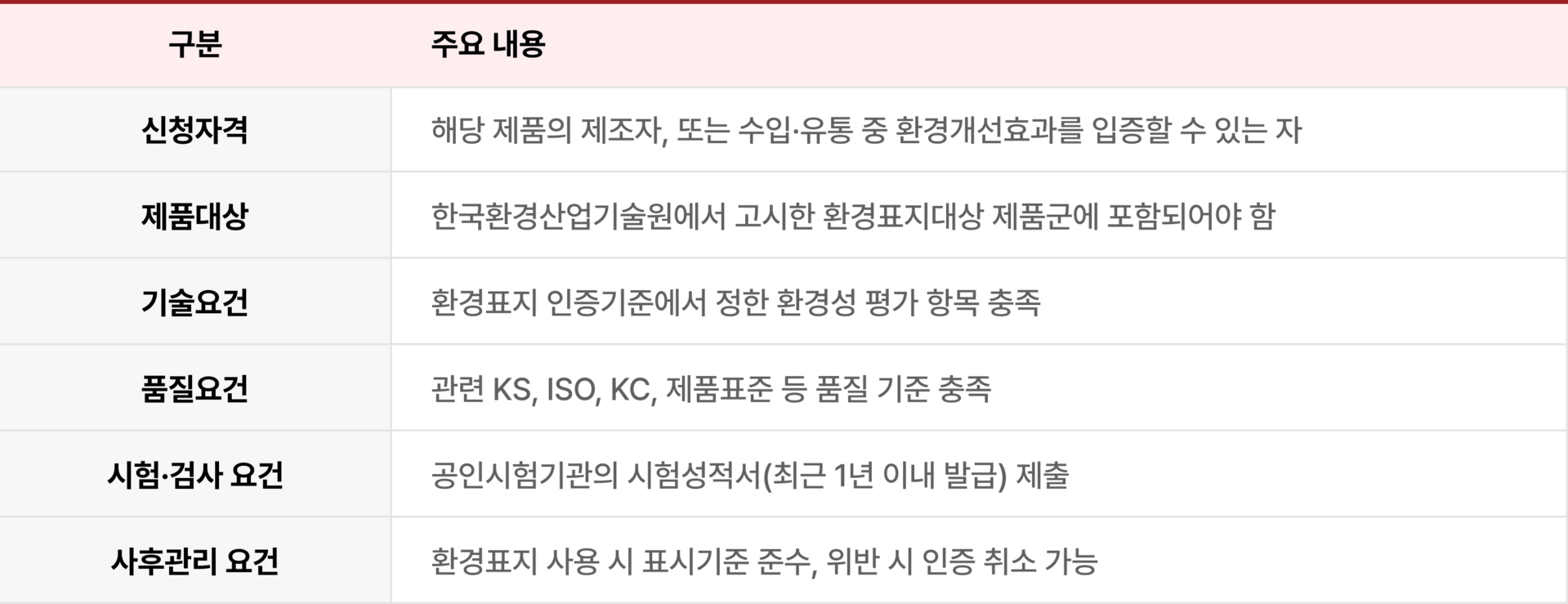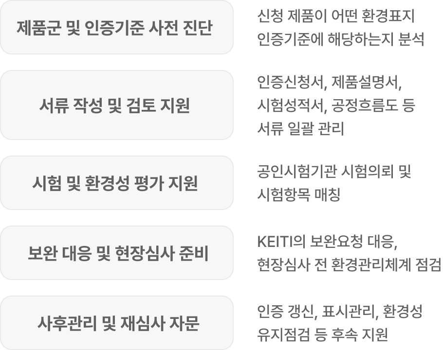 | 사후관리 및 재심사 자문 | 인증 갱신, 표시관리, 환경성 유지점검 등 후속 지원 |