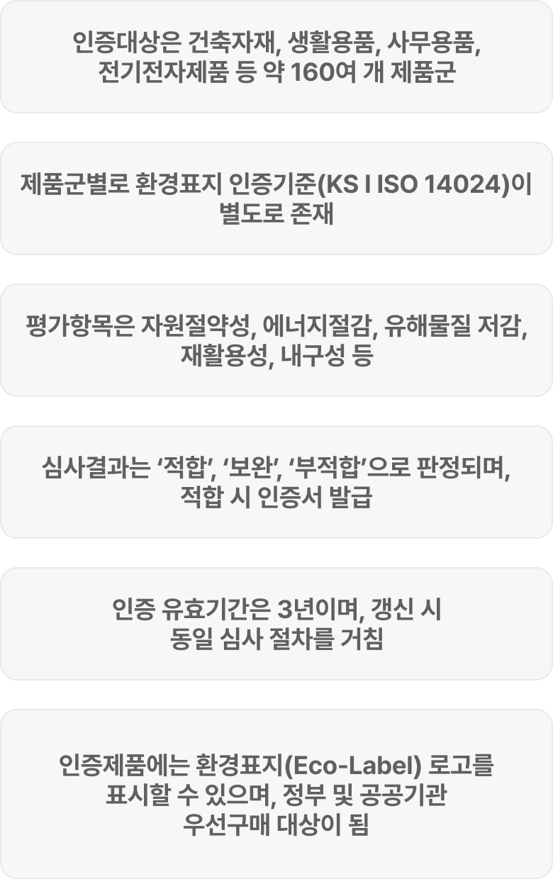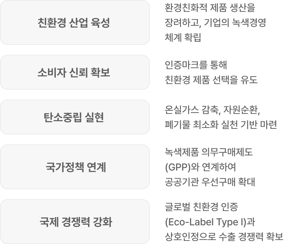 | 국제 경쟁력 강화 | 글로벌 친환경 인증(Eco-Label Type I)과 상호인정으로 수출 경쟁력 확보 |