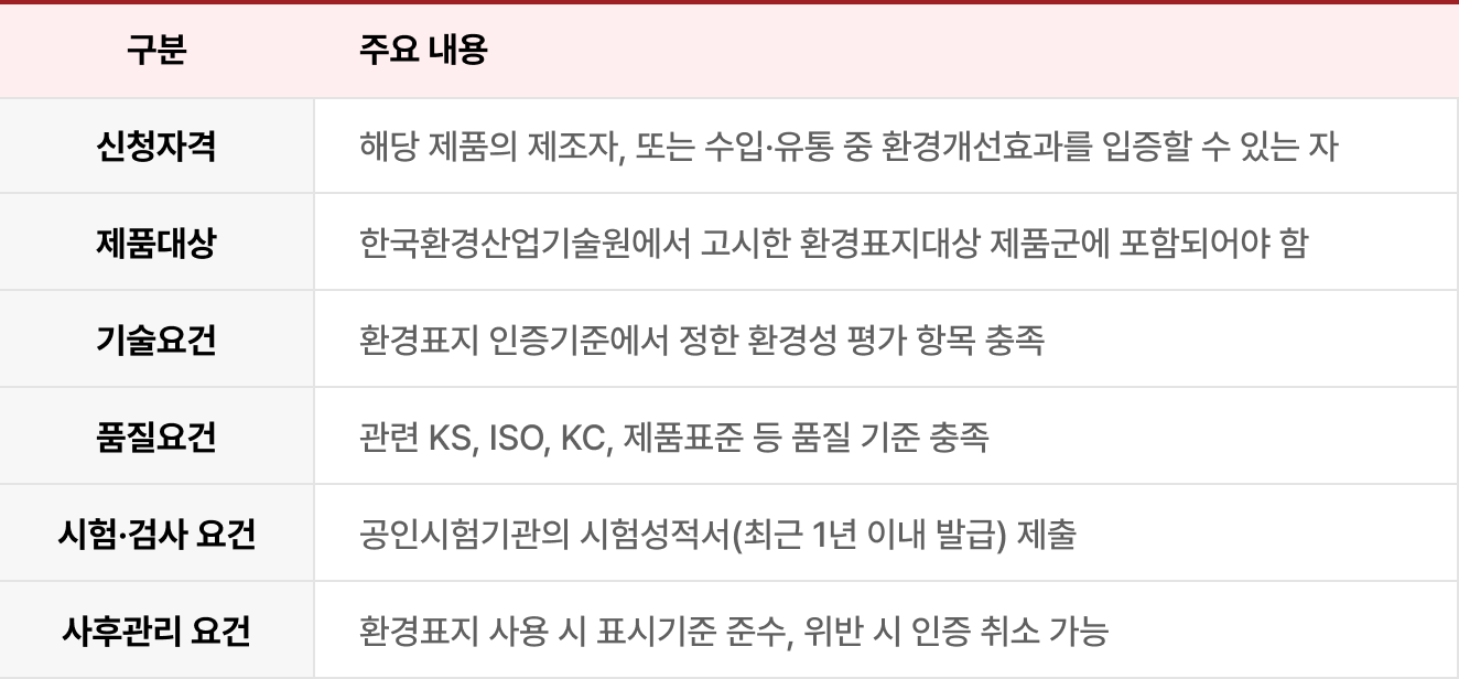 환경표지인증 신청을 위해 충족해야 할 기본 요건은 다음과 같습니다.