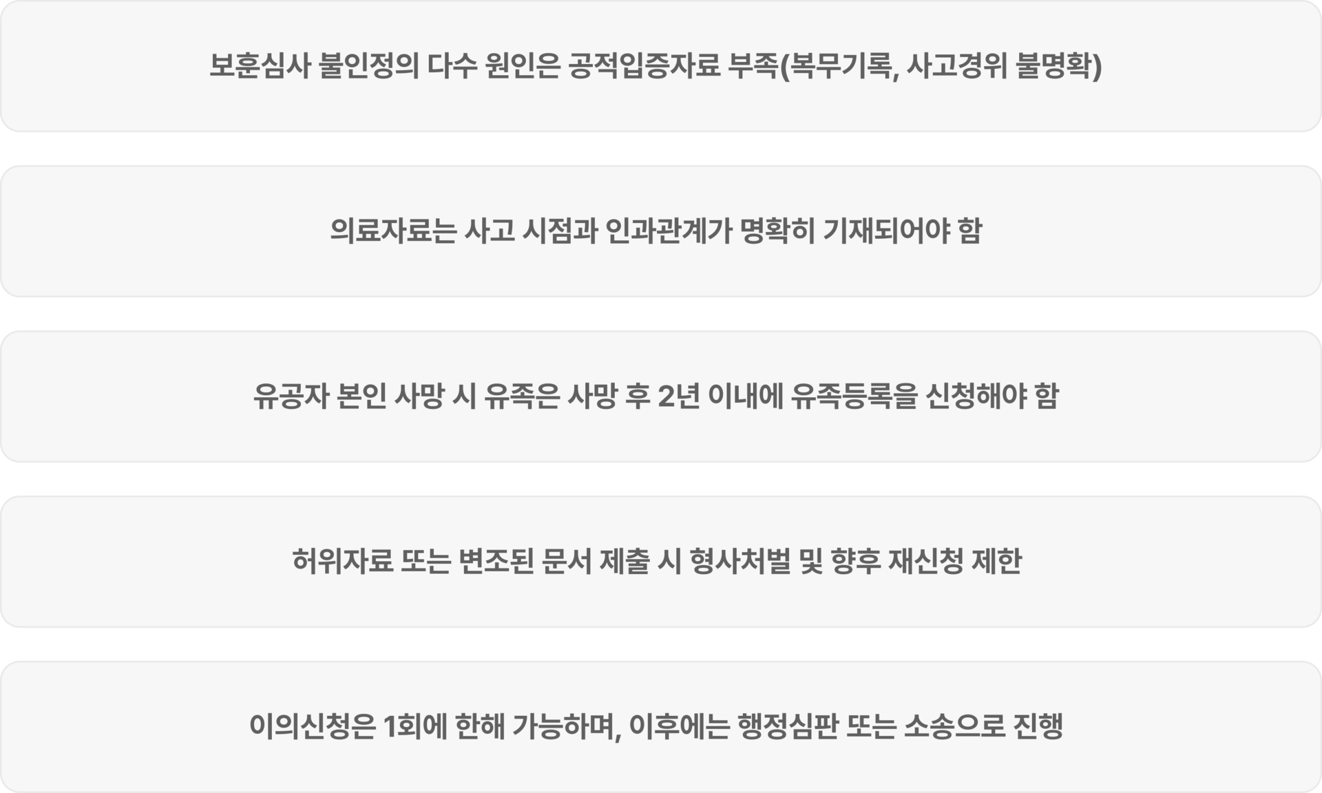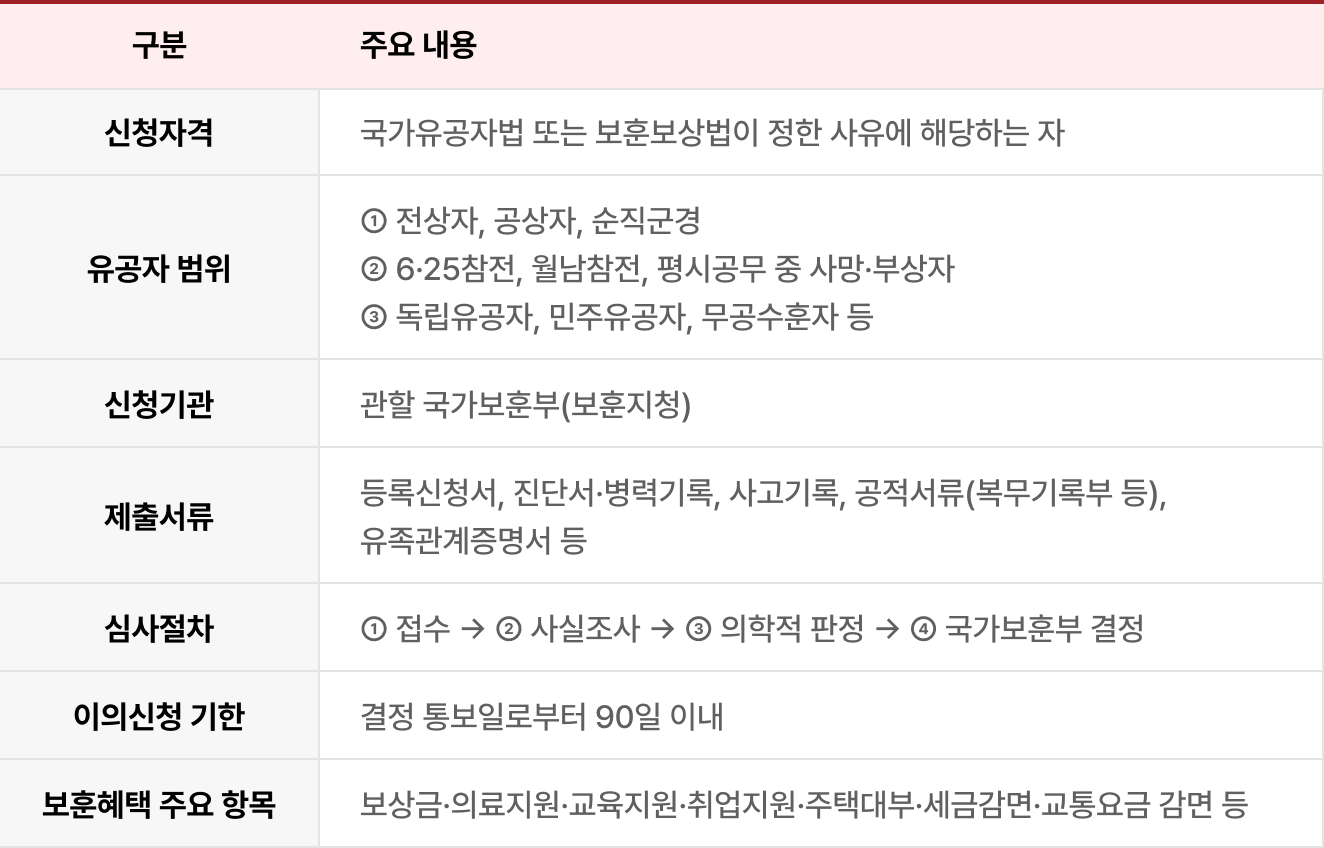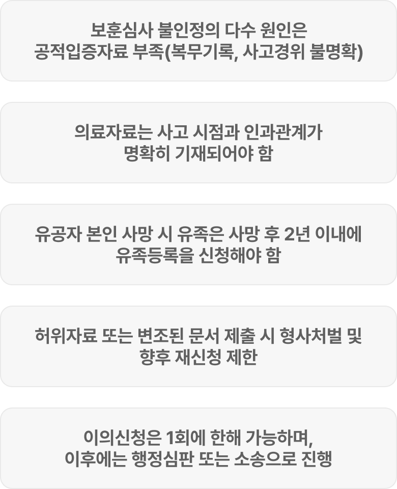 | 등록신청서류 작성 및 보훈지청 접수 대행 | 사고경위서, 진단서, 공적서류, 가족관계 증빙 일괄 정비 |