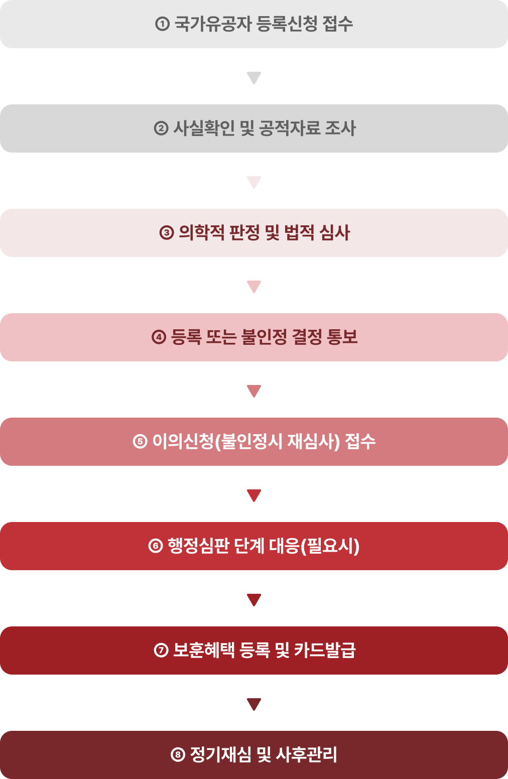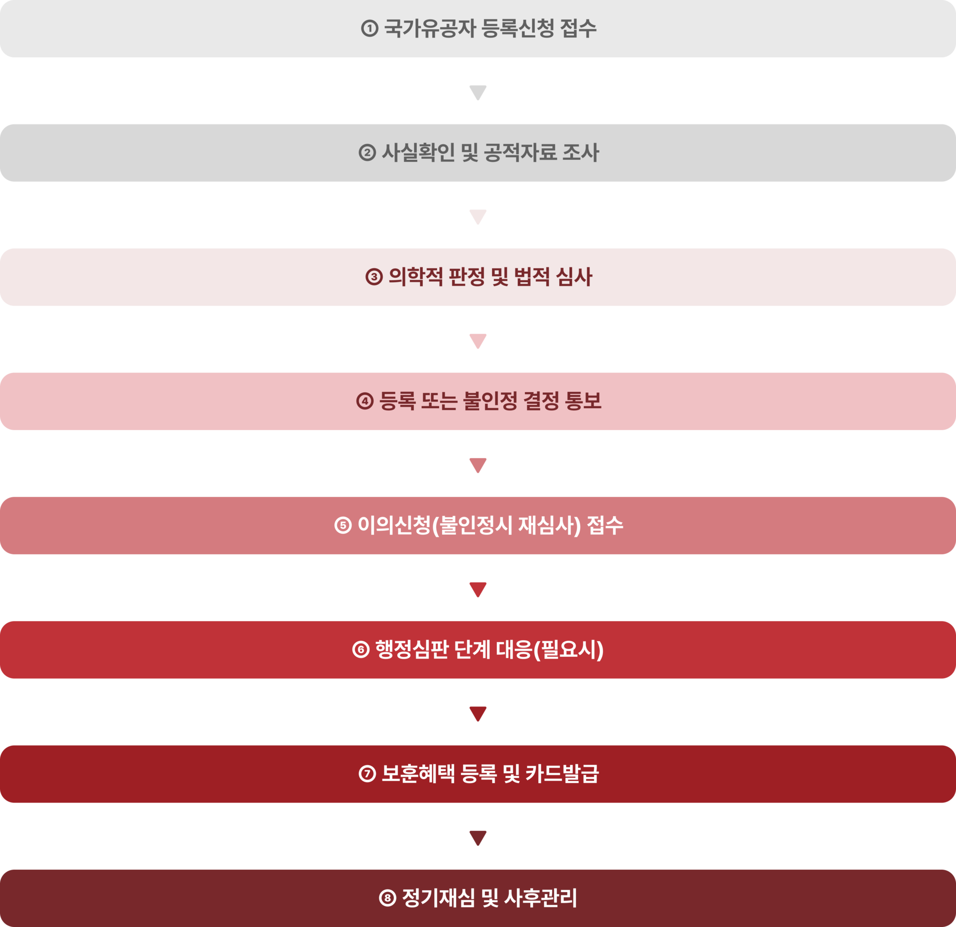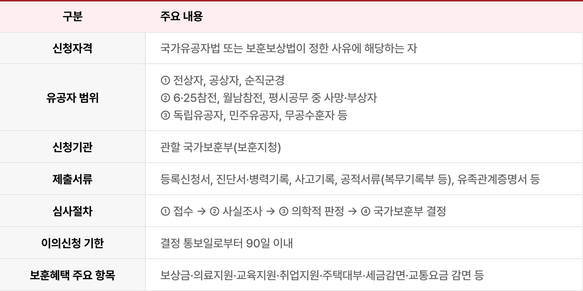 | 등록신청서류 작성 및 보훈지청 접수 대행 | 사고경위서, 진단서, 공적서류, 가족관계 증빙 일괄 정비 |