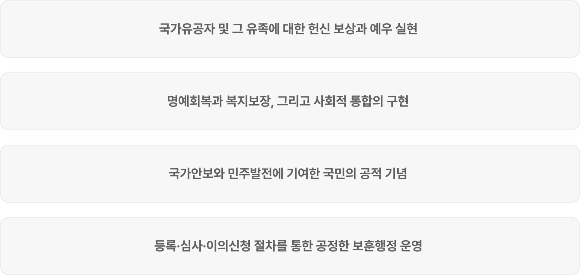 국가보훈부는 이를 위해 등록심사, 보상금 지급, 의료·교육·취업지원 등 종합적인 보훈행정 업무를 수행합니다.