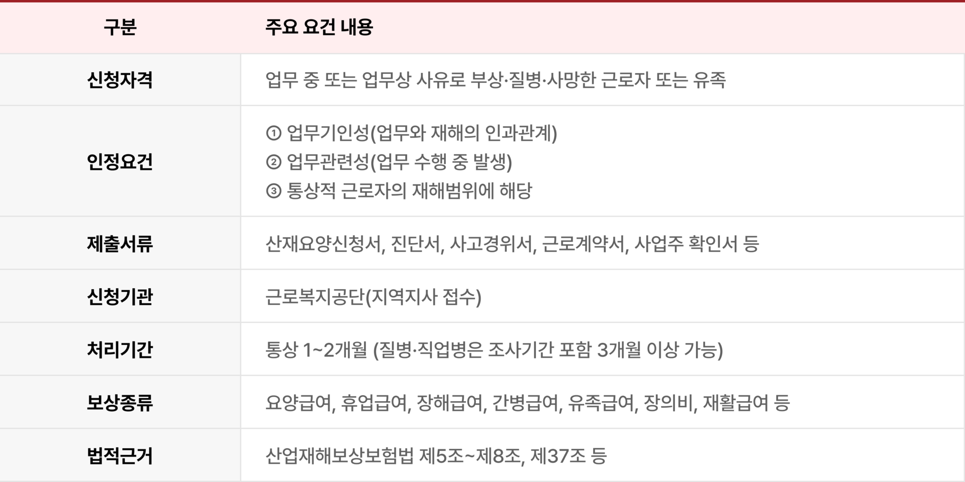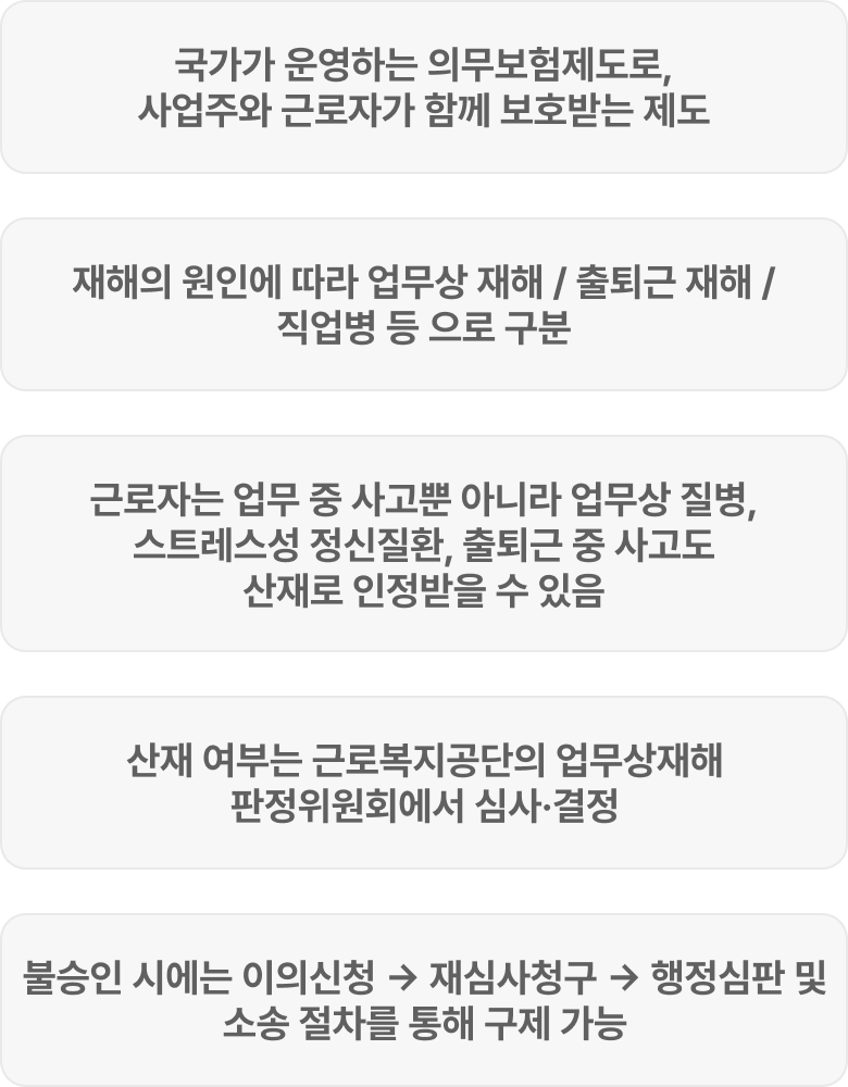 이는 「산업재해보상보험법」에 따라 근로복지공단이 관장하며, 모든 사업주는 상시 근로자를 1인 이상 고용하는 경우 의무적으로 산재보험에 가입해야 합니다.