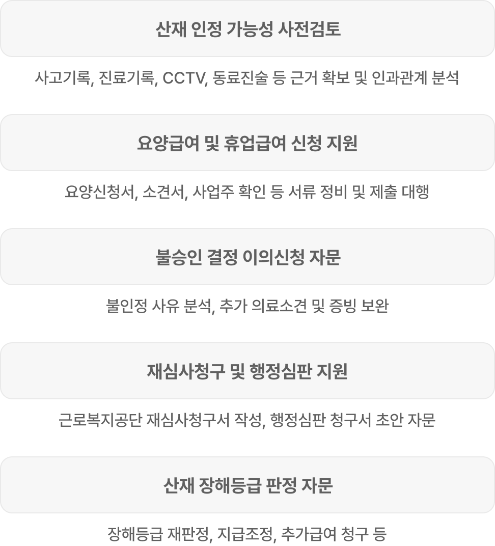 | 산재 인정 가능성 사전검토 | 사고기록, 진료기록, CCTV, 동료진술 등 근거 확보 및 인과관계 분석 |