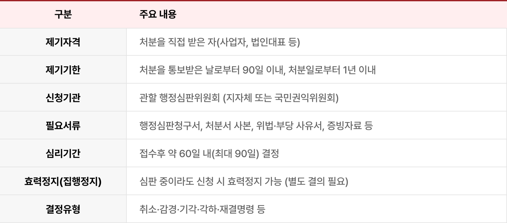 | 행정심판 청구요건 및 절차 안내 | 청구기간, 관할기관, 제출서류 등 행정법규 기준 설명 |