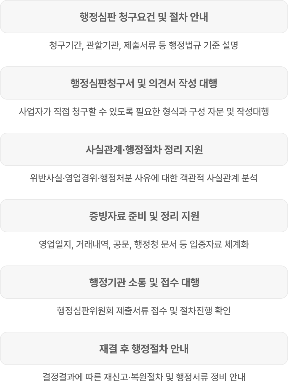 | 행정심판청구서 및 의견서 작성 대행 | 사업자가 직접 청구할 수 있도록 필요한 형식과 구성 자문 및 작성대행 |