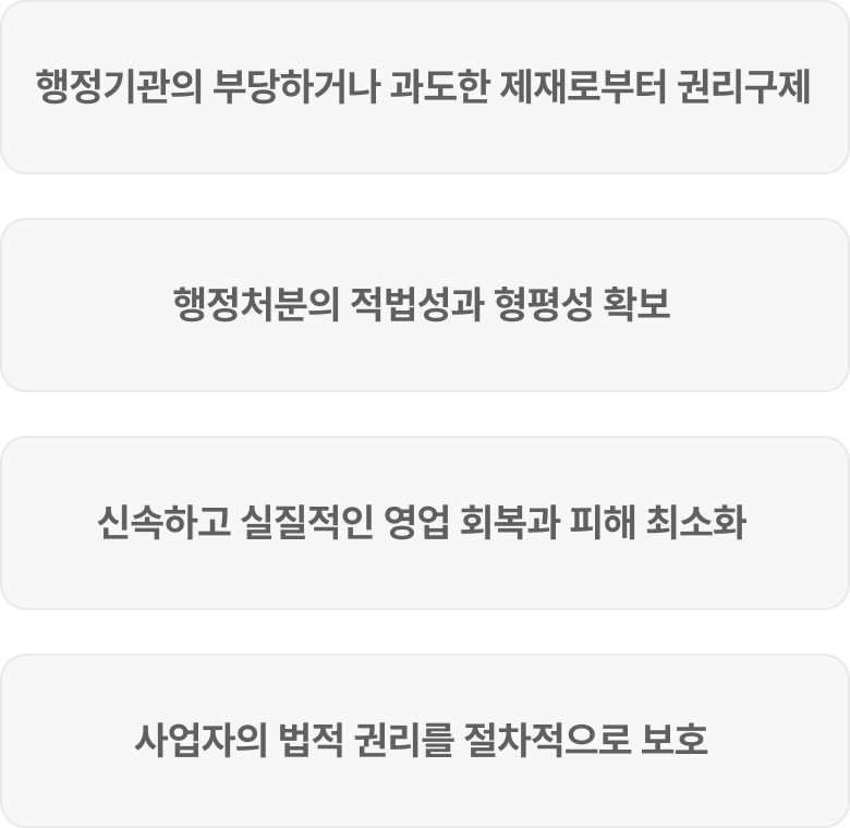 행정청(지자체·관할 부처 등)이 법령 위반을 이유로 사업자에게 내린 영업정지·영업허가취소 등 제재처분에 대해 사업자가 부당하거나 과도하다고 판단될 때, 그 처분의 취소 또는 감경을 요구하기 위해 제기하는 법적 불복 절차를 말합니다.