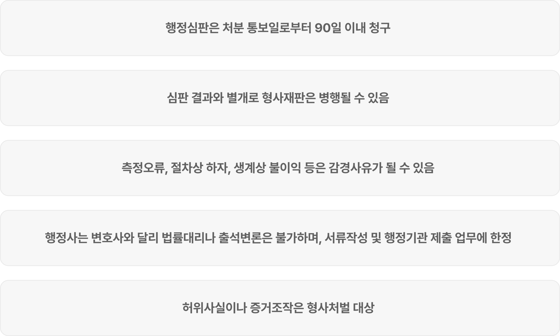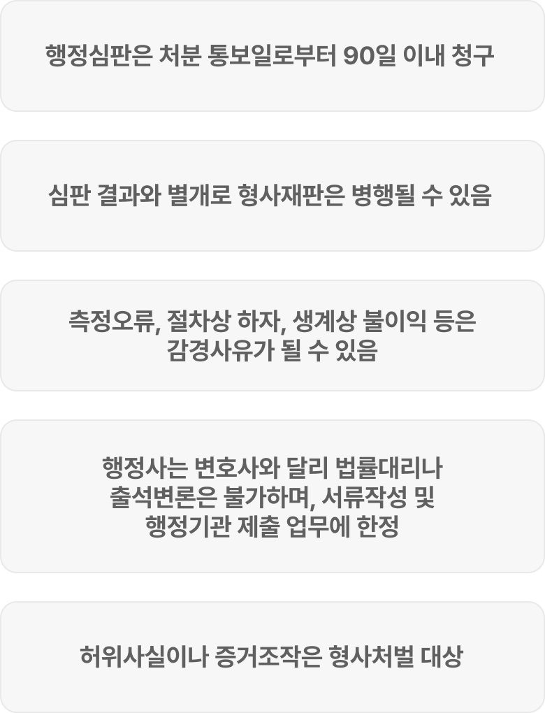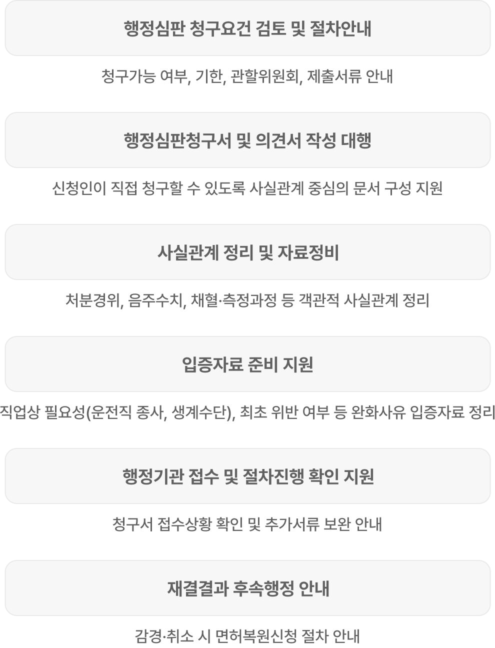 | 사실관계 정리 및 자료정비 | 처분경위, 음주수치, 채혈·측정과정 등 객관적 사실관계 정리 |