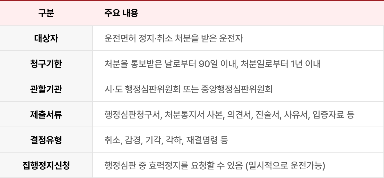 도로교통법상 음주운전으로 인해 행정청(경찰서 또는 지방경찰청)으로부터 운전면허 정지·취소 처분을 받은 경우, 그 처분이 부당하거나 과도하다고 판단될 때 행정심판위원회에 처분의 취소 또는 감경을 요청하는 행정절차를 말합니다.