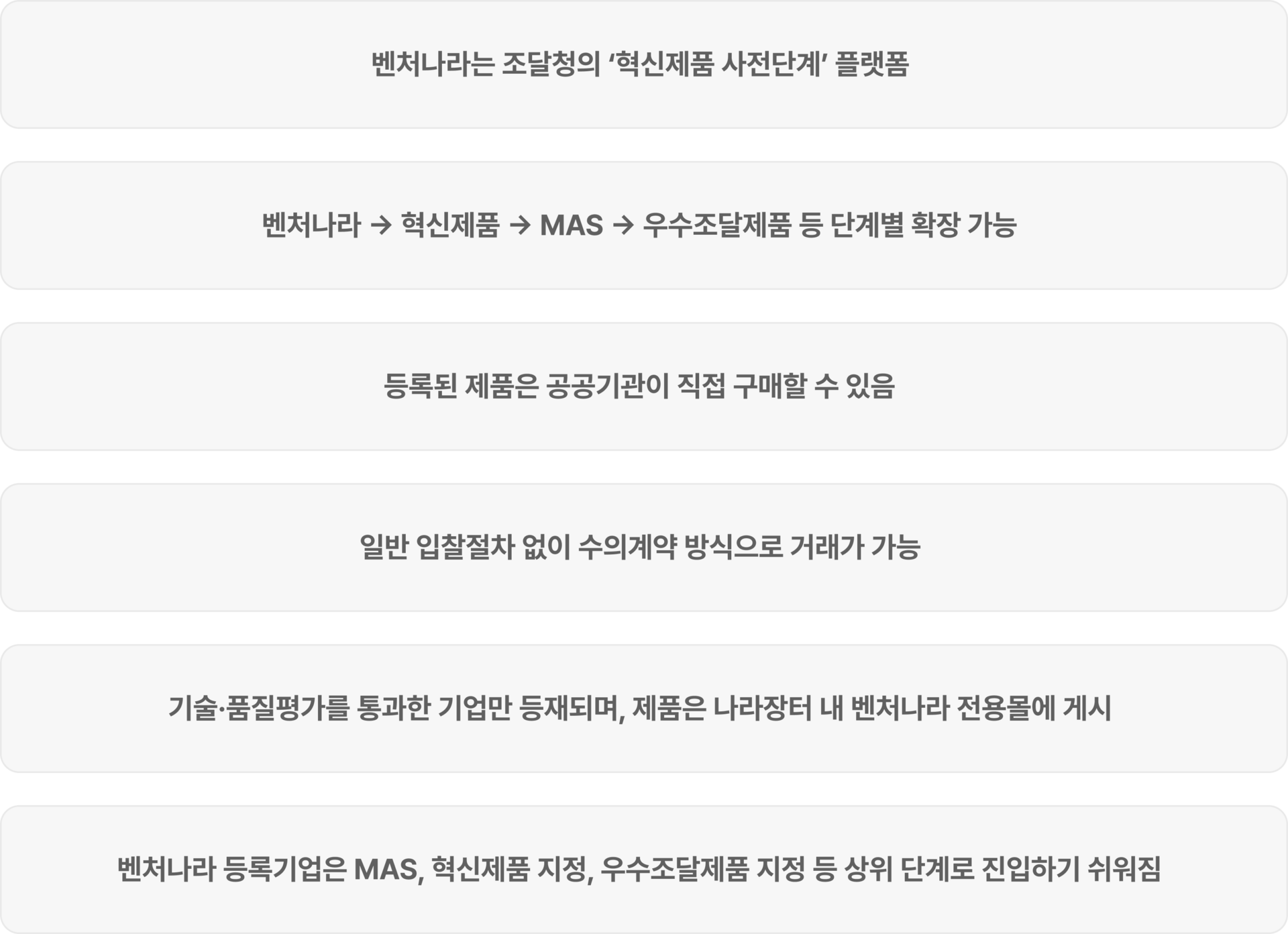 조달청이 운영하는 공공조달 전용 온라인 플랫폼인 ‘벤처나라’ 에 혁신성과 기술성을 갖춘 중소·벤처기업의 제품을 등록해 공공기관이 직접 구매할 수 있도록 지원하는 제도입니다.