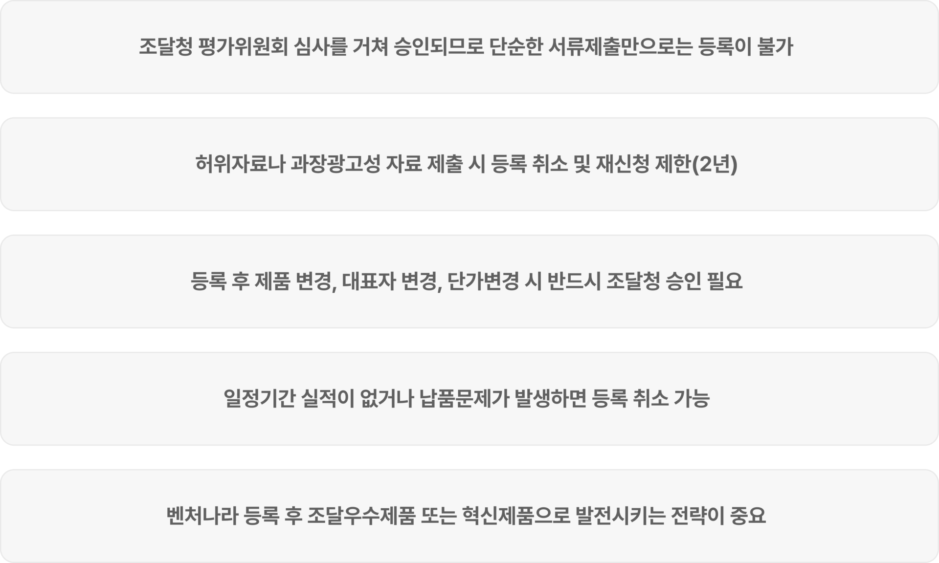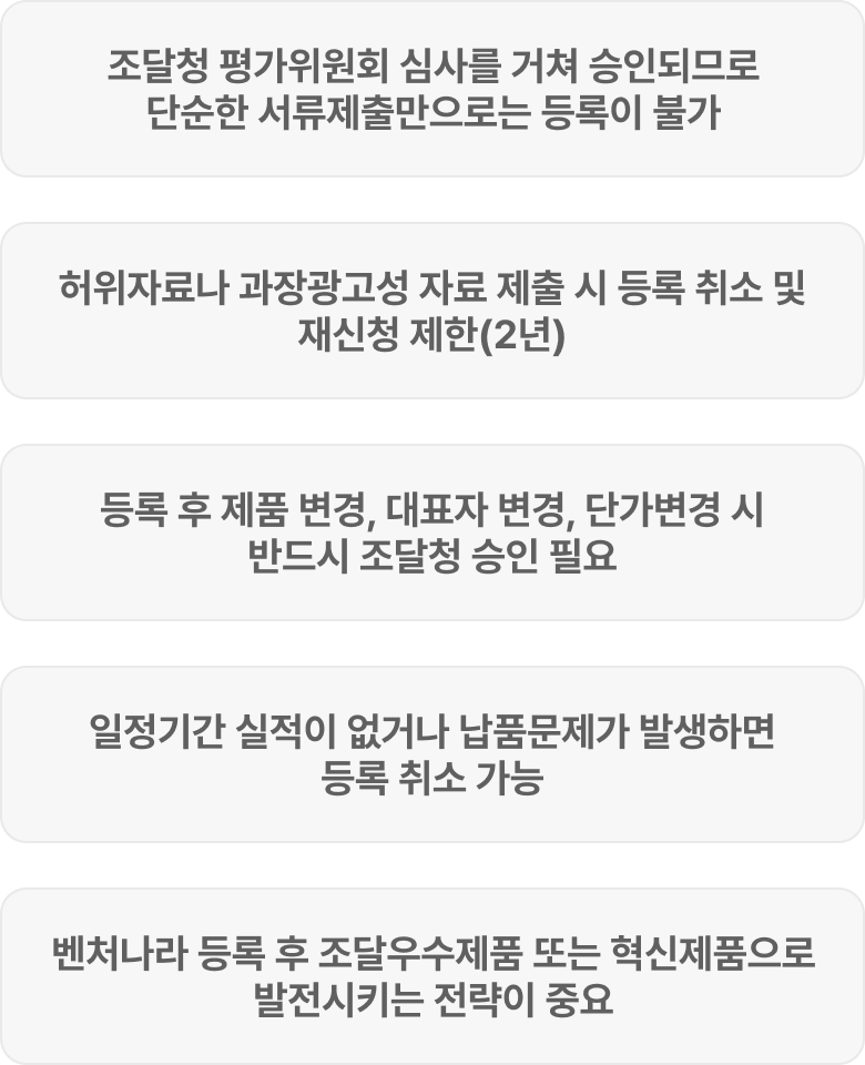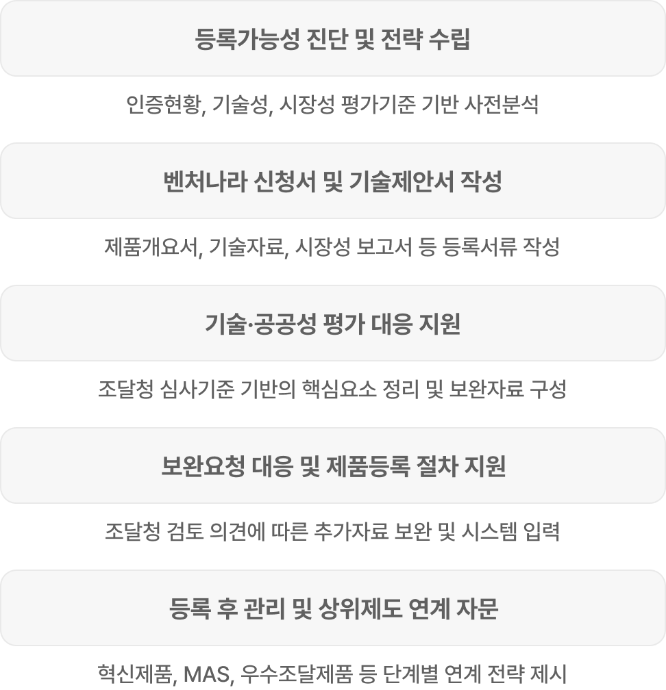 | 등록 후 관리 및 상위제도 연계 자문 | 혁신제품, MAS, 우수조달제품 등 단계별 연계 전략 제시 |
