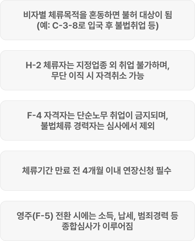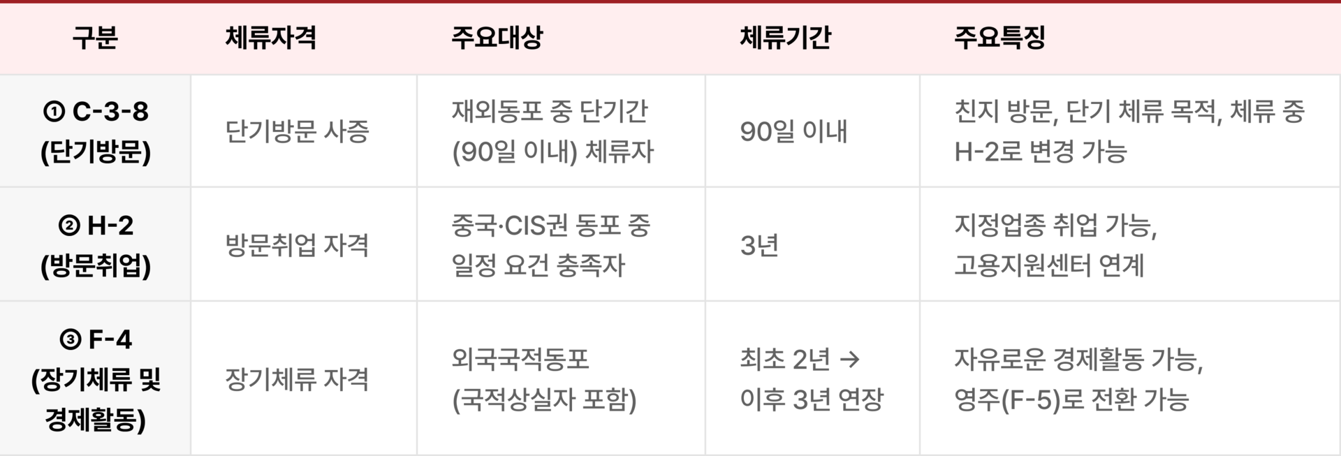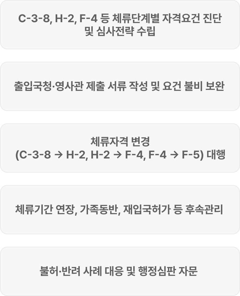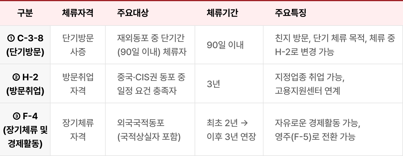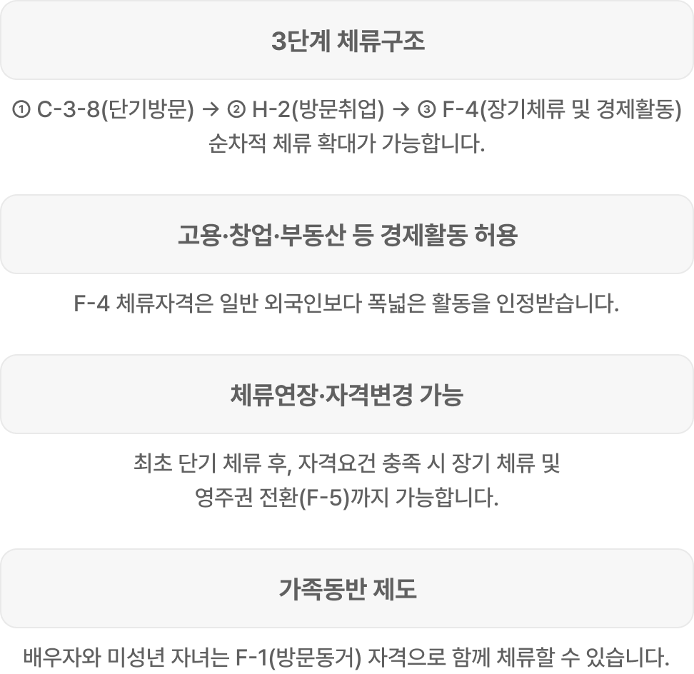 | 3단계 체류구조 | ① C-3-8(단기방문) → ② H-2(방문취업) → ③ F-4(장기체류 및 경제활동) 순차적 체류 확대가 가능합니다. |