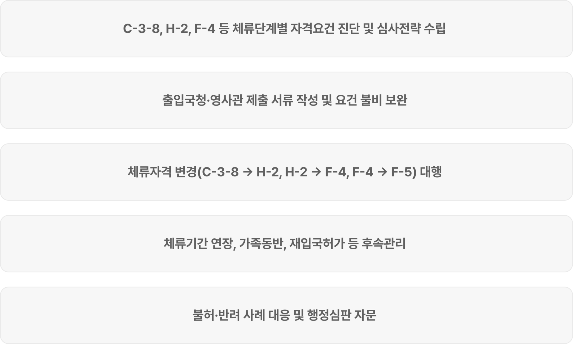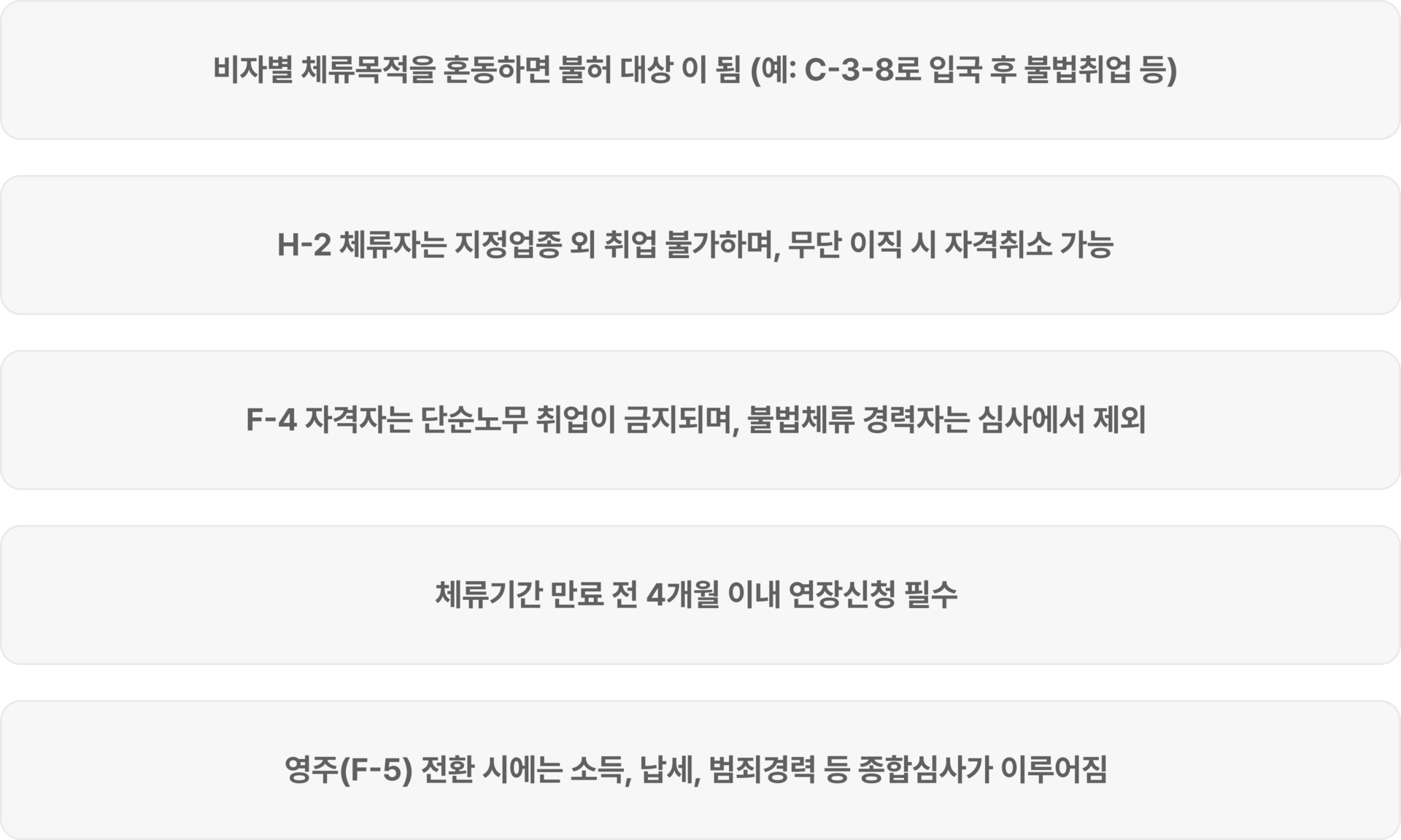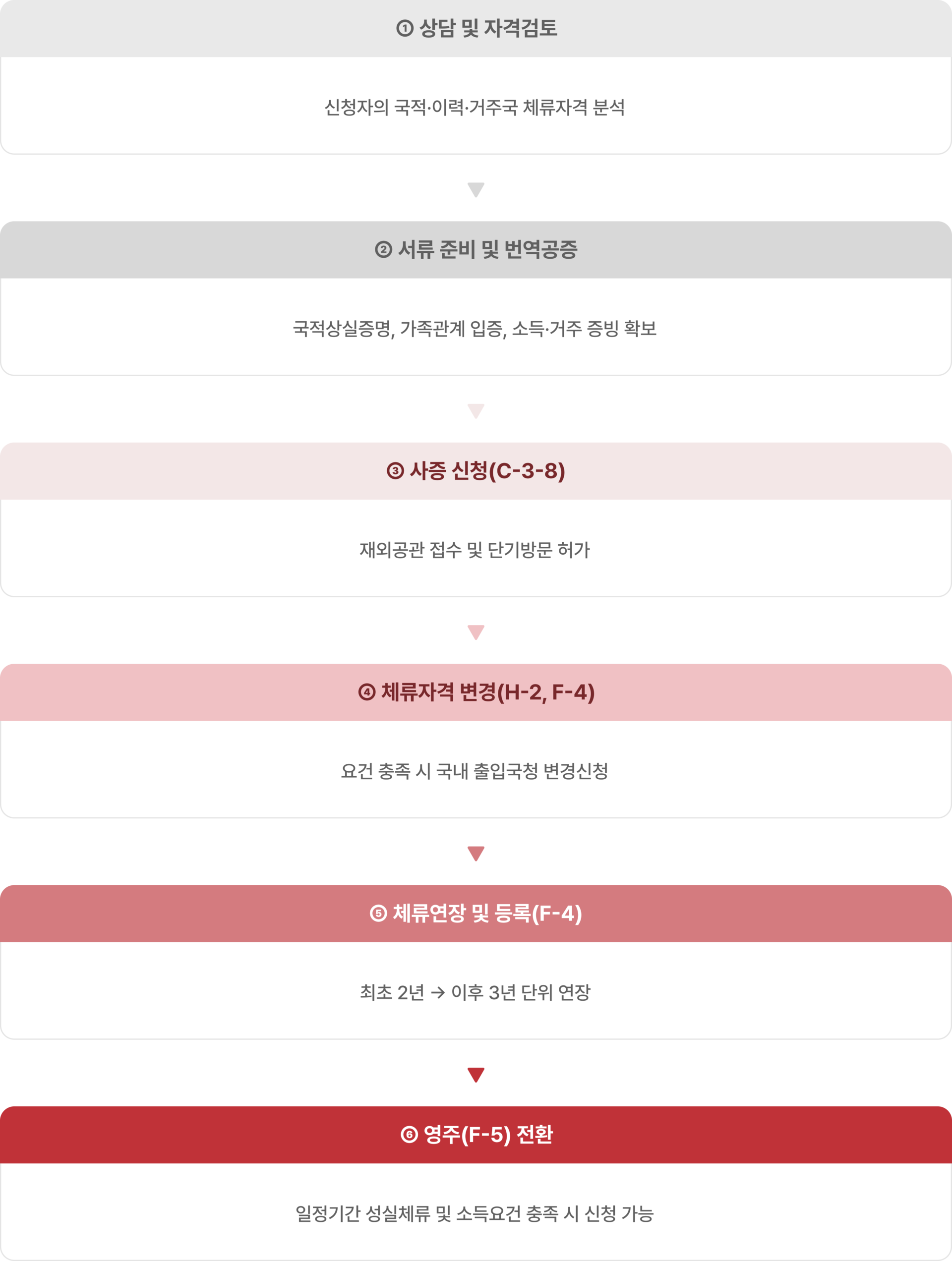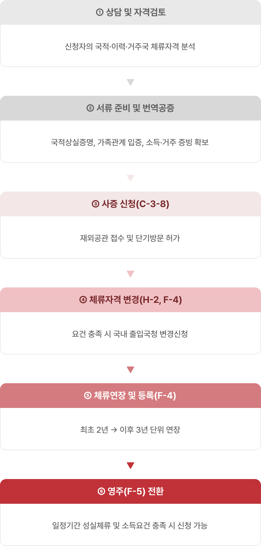| 3단계 체류구조 | ① C-3-8(단기방문) → ② H-2(방문취업) → ③ F-4(장기체류 및 경제활동) 순차적 체류 확대가 가능합니다. |