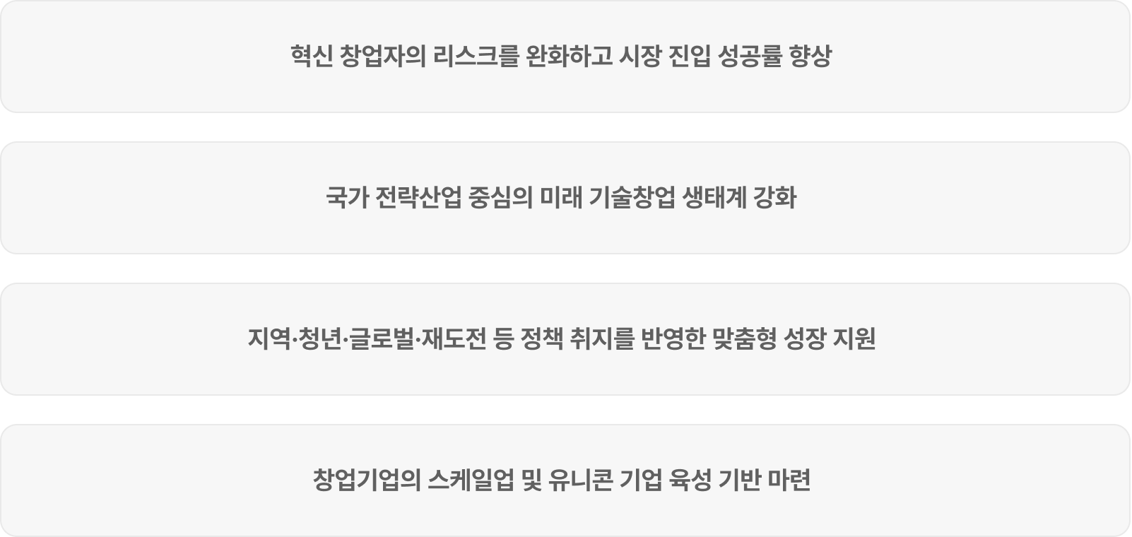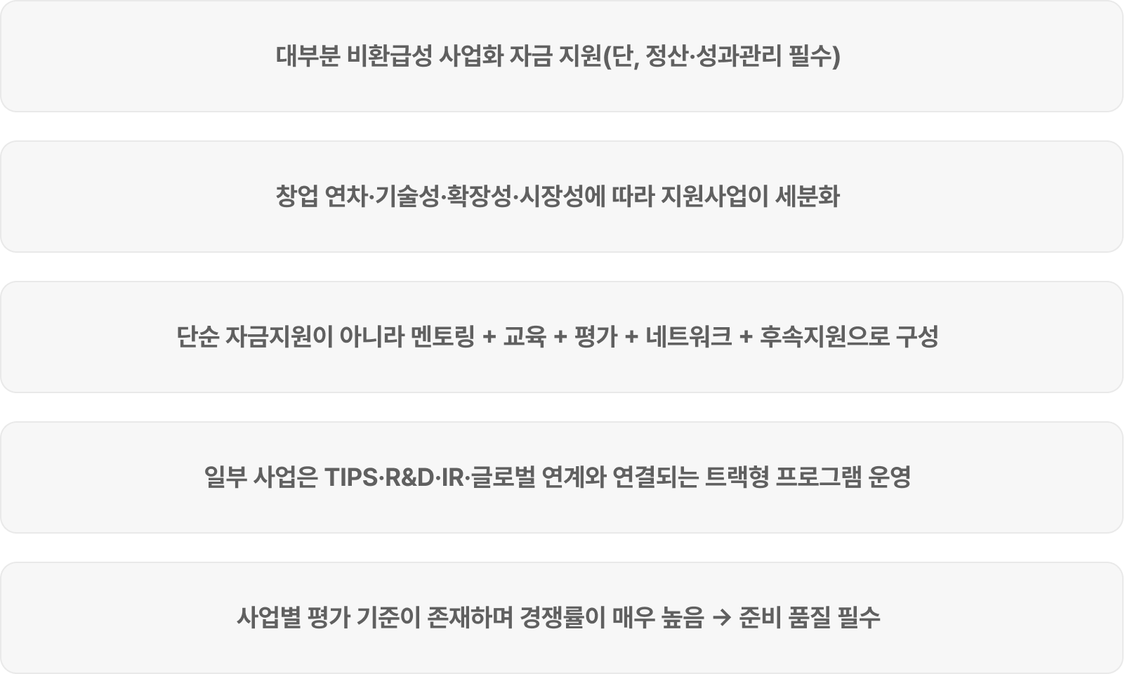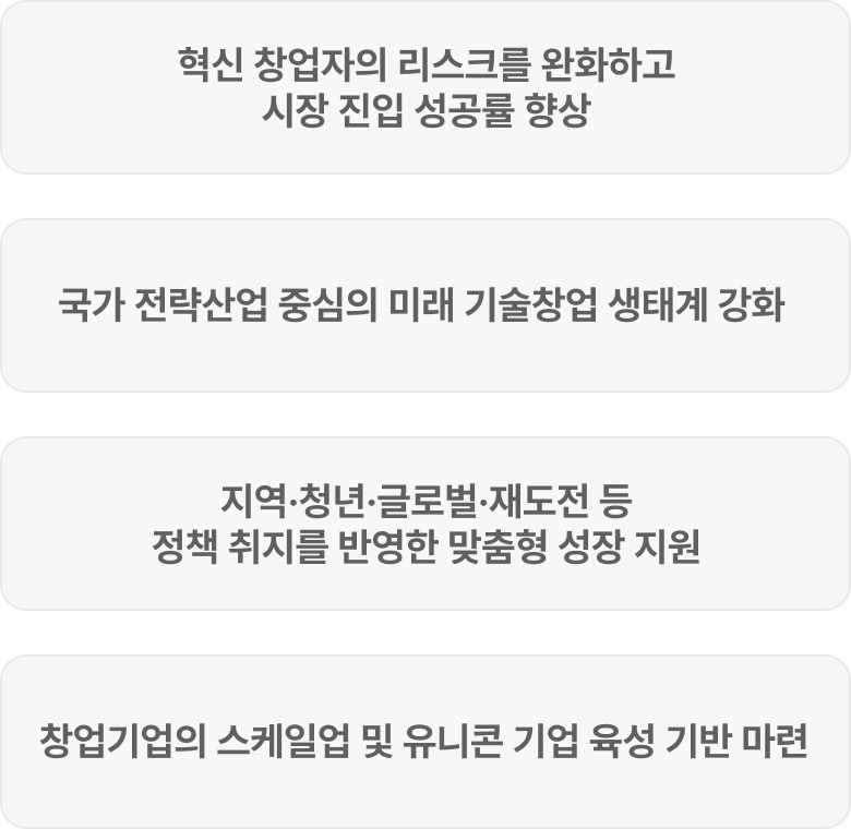 기업의 성장 단계별 맞춤형으로 제공하는 비환급성 지원금, 사업화 자금, 멘토링, 인프라, R&D, 투자 연계형 지원 프로그램입니다.