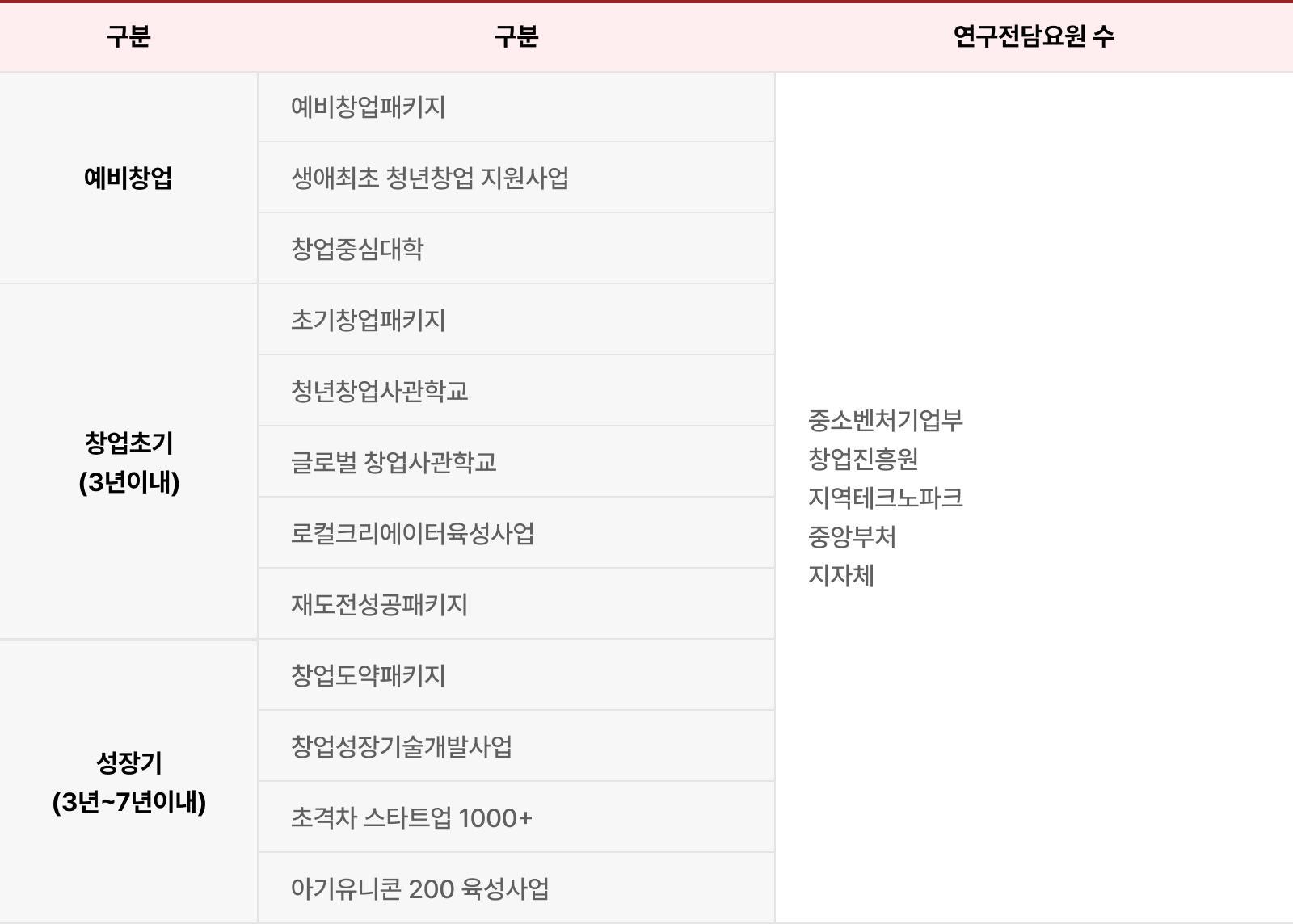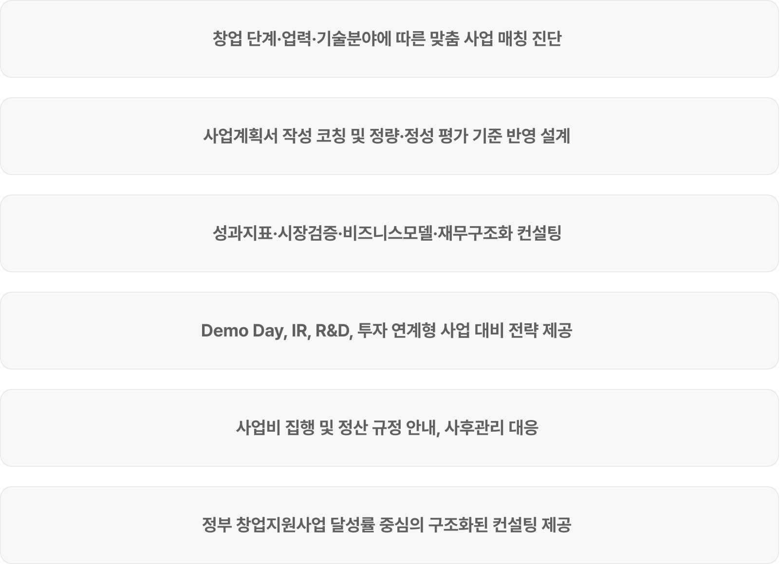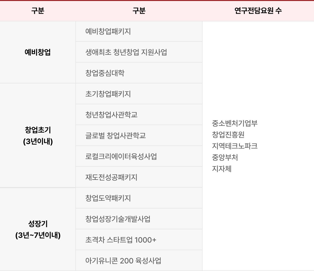 기업의 성장 단계별 맞춤형으로 제공하는 비환급성 지원금, 사업화 자금, 멘토링, 인프라, R&D, 투자 연계형 지원 프로그램입니다.