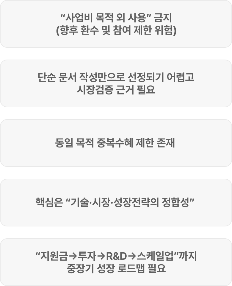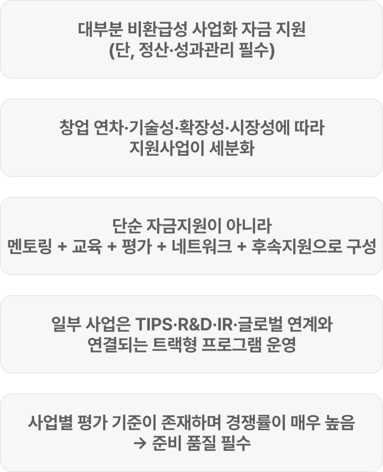 단순한 현금 지원이 아닌 교육·전문가 멘토링·IR·사업검증·해외진출까지 기업의 스케일업 로드맵을 지원한다는 특징이 있습니다.
