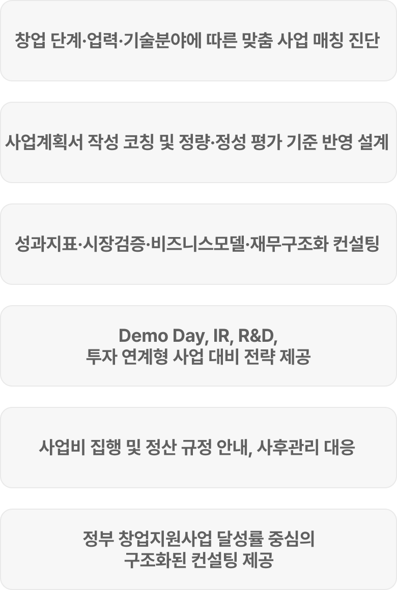 다양한 요소별로 신청사업이 상이하기 때문에 사전 사업아이템 등의 진단이 필요합니다.