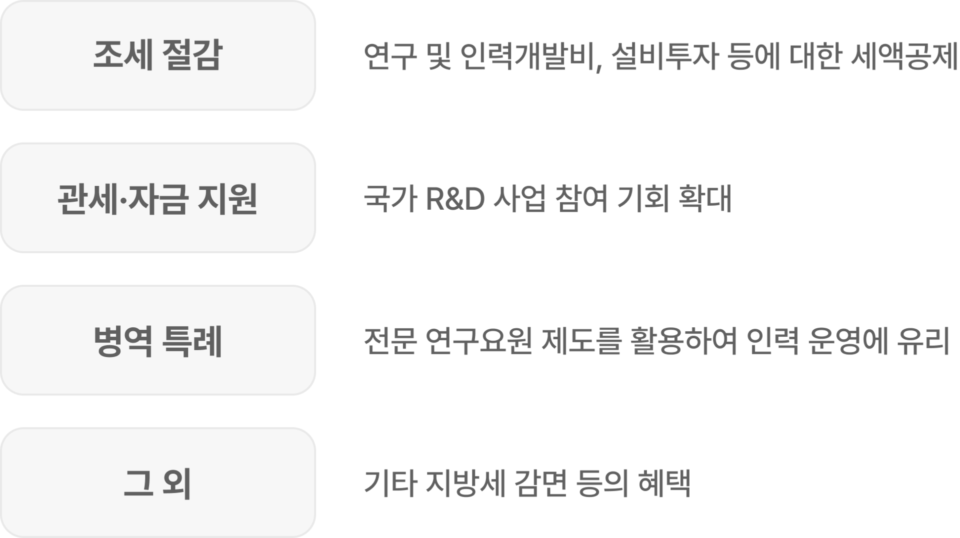 | 조세 절감 | 연구 및 인력개발비, 설비투자 등에 대한 세액공제 |