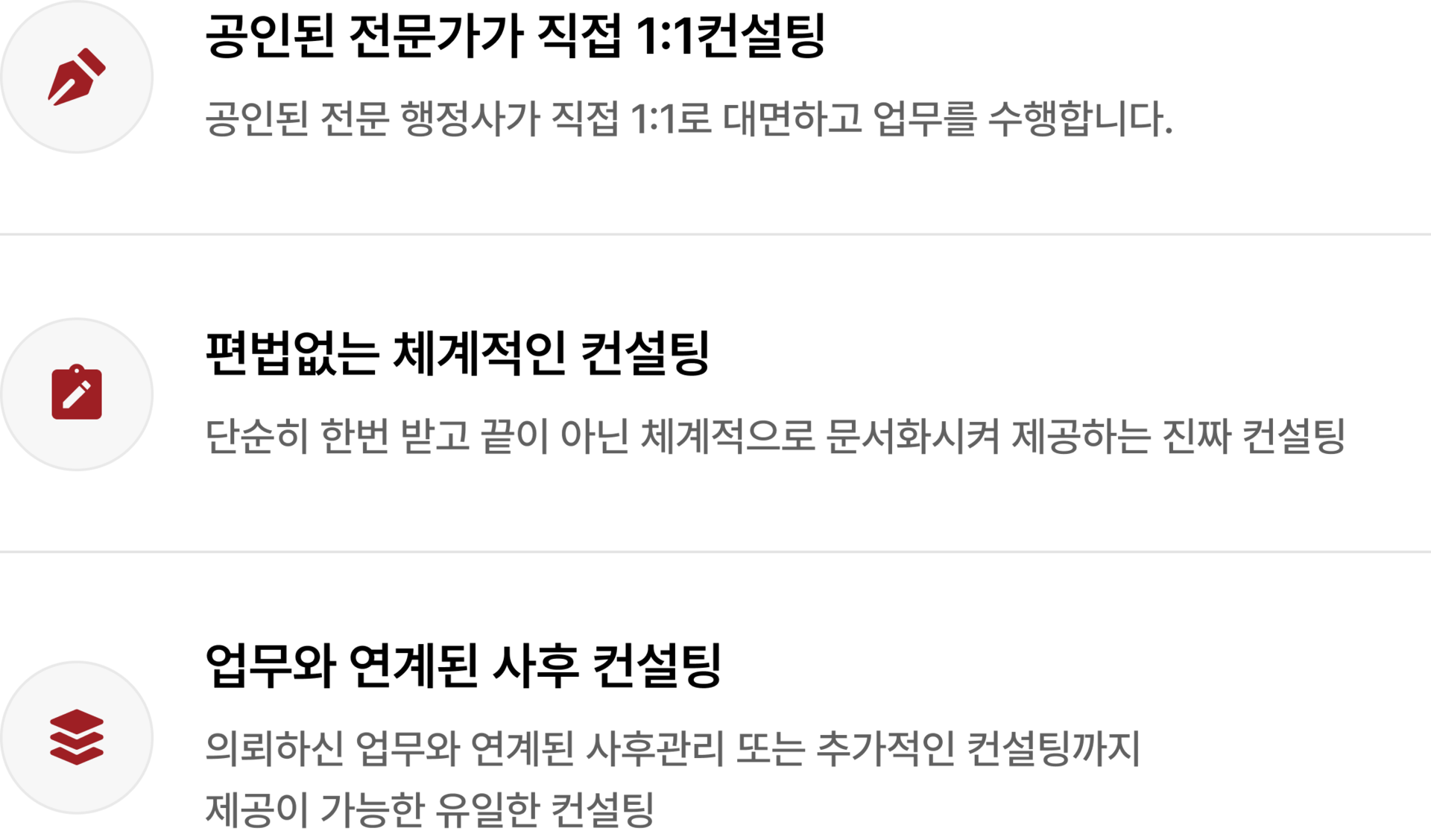 ![]() | 공인된 전문가가 직접 1:1컨설팅 공인된 전문 행정사가 직접 1:1로 대면하고 업무를 수행합니다. |