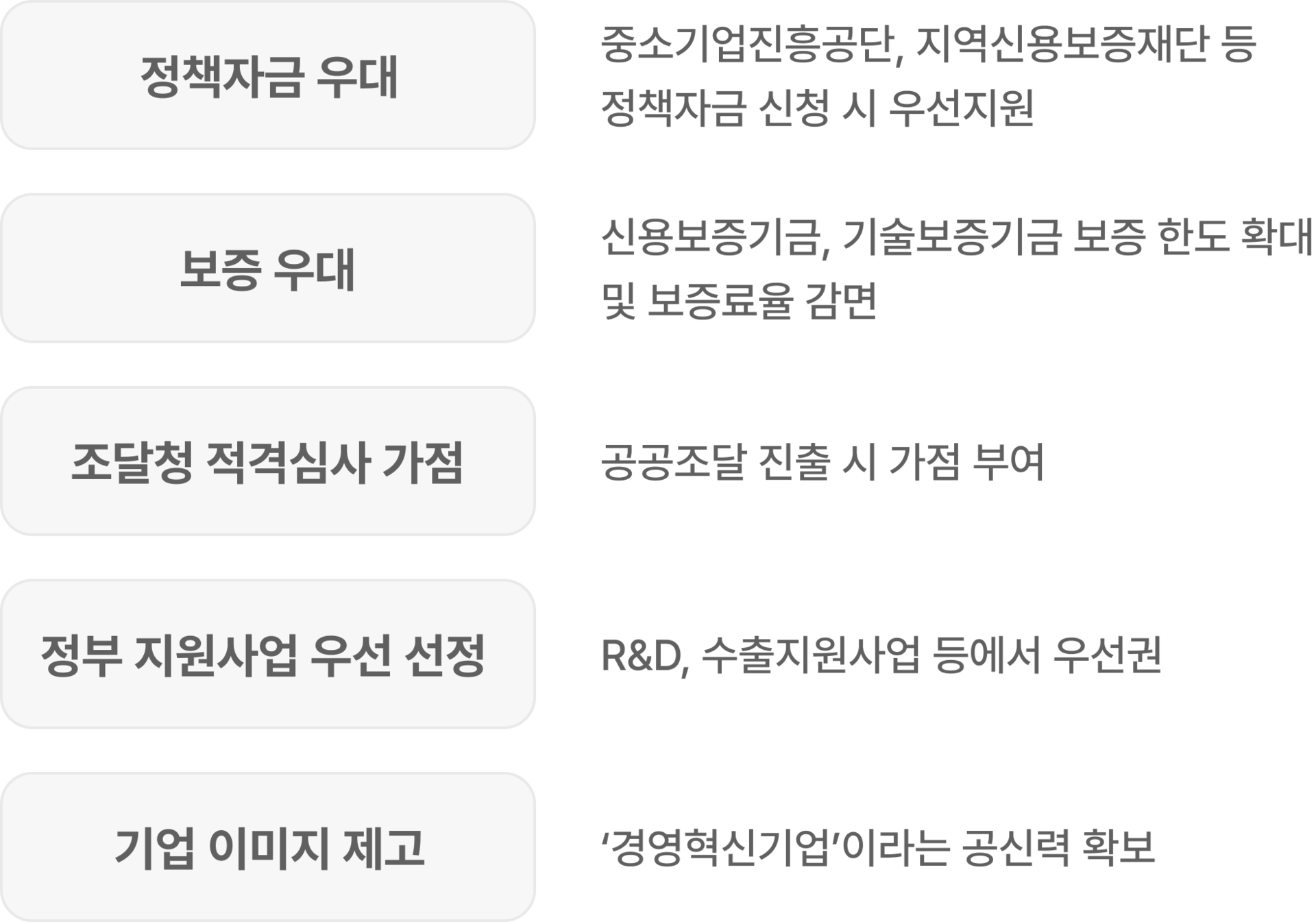 | 정부 지원사업 우선 선정 | R&D, 수출지원사업 등에서 우선권 |
